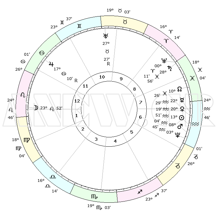 | | ΘΕΣΕΙΣ ΠΛΑΝΗΤΩΝ ΑΣΤΡΟΛΟΓΙΚΟΥ ΧΑΡΤΗ ΤΗΣ ΣΤΙΓΜΗΣ ΑΥΤΗΣ | | | | Πλανήτης | Ζώδιο | Μοίρες | Δεκαήμ. | Σε οίκο | Απόκλιση | | Ακμές των οίκων | | Ηλιος | Υδροχόος | 13°47' | Δεύτερο | 7 | 16 S 41 | | 1ος | 08°16' | Λέων | | Σελήνη | Λέων | 23°04' | Τρίτο | 1 | 15 N 11 | | 2ος | 29°57' | Λέων | | Ερμής | Υδροχόος | 22°23' | Τρίτο | 7 | 15 S 43 | | 3ος | 26°07' | Παρθένος | | Αφροδίτη | Υδροχόος | 20°15' | Τρίτο | 7 | 16 S 03 | | 4ος | 28°02' | Ζυγός | | Αρης | Υδροχόος | 08°01' | Πρώτο | 6 | 19 S 16 | | 5ος | 03°45' | Τοξότης | | Δίας | Καρκίνος | 17°11'R | Δεύτερο | 12 | 22 N 38 | | 6ος | 08°09' | Αιγόκερως | | Κρόνος | Ιχθείς | 28°55' | Τρίτο | 9 | 02 S 25 | | 7ος | 08°16' | Υδροχόος | | Ουρανός | Ταύρος | 27°27'R | Τρίτο | 10 | 19 N 24 | | 8ος | 29°57' | Υδροχόος | | Ποσειδώνας | Κριός | 00°11' | Πρώτο | 9 | 01 S 08 | | 9ος | 26°07' | Ιχθείς | | Πλούτωνας | Υδροχόος | 03°45' | Πρώτο | 6 | 23 S 01 | | 10ος | 28°02' | Κριός | | Β. Δεσμός | Ιχθείς | 10°26' | Δεύτερο | 8 | 07 S 39 | | 11ος | 03°45' | Δίδυμοι | | Ωροσκόπος | Λέων | 08°16' | Πρώτο | | | 12ος | 08°09' | Καρκίνος | | Μεσουράνημα | Κριός | 28°02' | Τρίτο | | | |