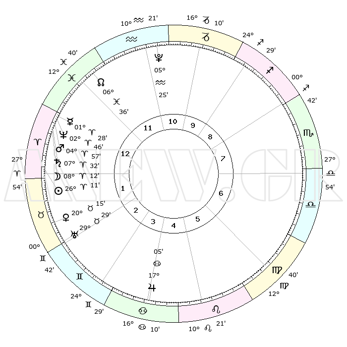 | | ΘΕΣΕΙΣ ΠΛΑΝΗΤΩΝ ΑΣΤΡΟΛΟΓΙΚΟΥ ΧΑΡΤΗ ΤΗΣ ΣΤΙΓΜΗΣ ΑΥΤΗΣ | | | | Πλανήτης | Ζώδιο | Μοίρες | Δεκαήμ. | Σε οίκο | Απόκλιση | | Ακμές των οίκων | | Ηλιος | Κριός | 26°37' | Τρίτο | 8 | 10 N 16 | | 1ος | 24°27' | Παρθένος | | Σελήνη | Κριός | 14°24' | Δεύτερο | 7 | 08 N 29 | | 2ος | 20°37' | Ζυγός | | Ερμής | Κριός | 02°05' | Πρώτο | 7 | 01 S 35 | | 3ος | 20°49' | Σκορπιός | | Αφροδίτη | Ταύρος | 20°47' | Τρίτο | 8 | 18 N 11 | | 4ος | 23°46' | Τοξότης | | Αρης | Κριός | 05°17' | Πρώτο | 7 | 01 N 12 | | 5ος | 26°50' | Αιγόκερως | | Δίας | Καρκίνος | 17°08' | Δεύτερο | 10 | 22 N 43 | | 6ος | 27°28' | Υδροχόος | | Κρόνος | Κριός | 07°35' | Πρώτο | 7 | 01 N 02 | | 7ος | 24°27' | Ιχθείς | | Ουρανός | Ταύρος | 29°30' | Τρίτο | 9 | 19 N 53 | | 8ος | 20°37' | Κριός | | Ποσειδώνας | Κριός | 02°47' | Πρώτο | 7 | 00 S 06 | | 9ος | 20°49' | Ταύρος | | Πλούτωνας | Υδροχόος | 05°25' | Πρώτο | 5 | 22 S 47 | | 10ος | 23°46' | Δίδυμοι | | Β. Δεσμός | Ιχθείς | 06°35' | Πρώτο | 6 | 09 S 06 | | 11ος | 26°50' | Καρκίνος | | Ωροσκόπος | Παρθένος | 24°27' | Τρίτο | | | 12ος | 27°28' | Λέων | | Μεσουράνημα | Δίδυμοι | 23°46' | Τρίτο | | | |