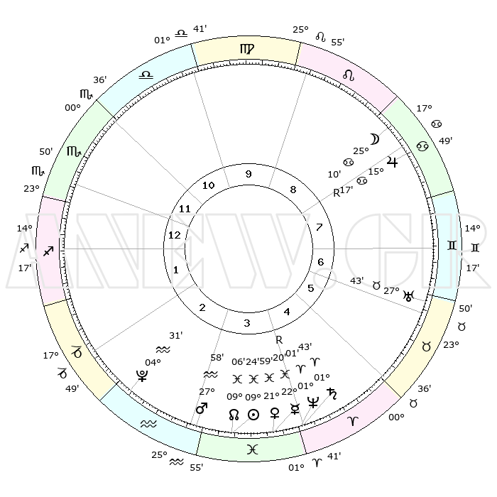 | | ΘΕΣΕΙΣ ΠΛΑΝΗΤΩΝ ΑΣΤΡΟΛΟΓΙΚΟΥ ΧΑΡΤΗ ΤΗΣ ΣΤΙΓΜΗΣ ΑΥΤΗΣ | | | | Πλανήτης | Ζώδιο | Μοίρες | Δεκαήμ. | Σε οίκο | Απόκλιση | | Ακμές των οίκων | | Ηλιος | Ιχθείς | 09°38' | Πρώτο | 12 | 07 S 57 | | 1ος | 17°49' | Ιχθείς | | Σελήνη | Καρκίνος | 28°19' | Τρίτο | 5 | 23 N 52 | | 2ος | 00°46' | Ταύρος | | Ερμής | Ιχθείς | 22°16'R | Τρίτο | 1 | 00 S 09 | | 3ος | 00°10' | Δίδυμοι | | Αφροδίτη | Ιχθείς | 22°16' | Τρίτο | 1 | 04 S 20 | | 4ος | 23°07' | Δίδυμοι | | Αρης | Υδροχόος | 28°09' | Τρίτο | 12 | 13 S 09 | | 5ος | 15°00' | Καρκίνος | | Δίας | Καρκίνος | 15°17'R | Δεύτερο | 5 | 22 N 54 | | 6ος | 10°40' | Λέων | | Κρόνος | Κριός | 01°45' | Πρώτο | 1 | 01 S 16 | | 7ος | 17°49' | Παρθένος | | Ουρανός | Ταύρος | 27°43' | Τρίτο | 2 | 19 N 28 | | 8ος | 00°46' | Σκορπιός | | Ποσειδώνας | Κριός | 01°01' | Πρώτο | 1 | 00 S 48 | | 9ος | 00°10' | Τοξότης | | Πλούτωνας | Υδροχόος | 04°31' | Πρώτο | 11 | 22 S 53 | | 10ος | 23°07' | Τοξότης | | Β. Δεσμός | Ιχθείς | 09°05' | Πρώτο | 12 | 08 S 10 | | 11ος | 15°00' | Αιγόκερως | | Ωροσκόπος | Ιχθείς | 17°49' | Δεύτερο | | | 12ος | 10°40' | Υδροχόος | | Μεσουράνημα | Τοξότης | 23°07' | Τρίτο | | | |