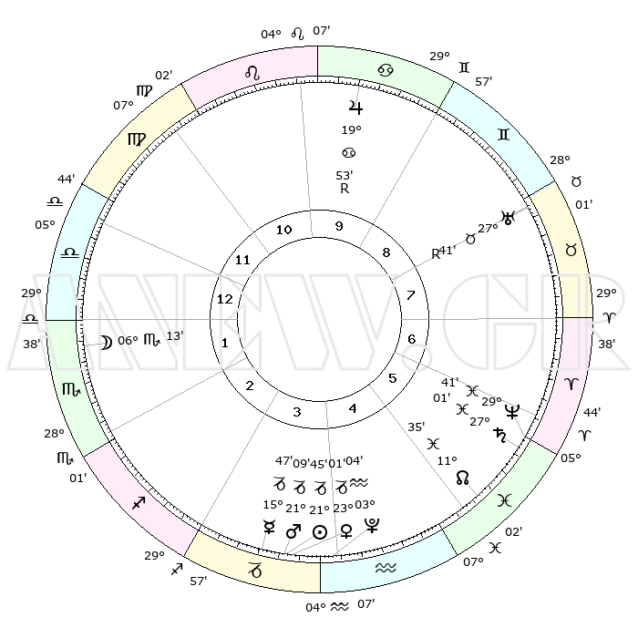 | | ΘΕΣΕΙΣ ΠΛΑΝΗΤΩΝ ΑΣΤΡΟΛΟΓΙΚΟΥ ΧΑΡΤΗ ΤΗΣ ΣΤΙΓΜΗΣ ΑΥΤΗΣ | | | | Πλανήτης | Ζώδιο | Μοίρες | Δεκαήμ. | Σε οίκο | Απόκλιση | | Ακμές των οίκων | | Ηλιος | Αιγόκερως | 21°37' | Τρίτο | 5 | 21 S 42 | | 1ος | 19°13' | Παρθένος | | Σελήνη | Σκορπιός | 04°35' | Πρώτο | 2 | 16 S 58 | | 2ος | 14°57' | Ζυγός | | Ερμής | Αιγόκερως | 15°34' | Δεύτερο | 4 | 24 S 06 | | 3ος | 14°56' | Σκορπιός | | Αφροδίτη | Αιγόκερως | 22°51' | Τρίτο | 5 | 22 S 22 | | 4ος | 17°52' | Τοξότης | | Αρης | Αιγόκερως | 21°02' | Τρίτο | 4 | 22 S 44 | | 5ος | 21°04' | Αιγόκερως | | Δίας | Καρκίνος | 19°54'R | Δεύτερο | 10 | 22 N 13 | | 6ος | 21°55' | Υδροχόος | | Κρόνος | Ιχθείς | 27°00' | Τρίτο | 7 | 03 S 14 | | 7ος | 19°13' | Ιχθείς | | Ουρανός | Ταύρος | 27°41'R | Τρίτο | 9 | 19 N 27 | | 8ος | 14°57' | Κριός | | Ποσειδώνας | Ιχθείς | 29°41' | Τρίτο | 7 | 01 S 21 | | 9ος | 14°56' | Ταύρος | | Πλούτωνας | Υδροχόος | 03°03' | Πρώτο | 5 | 23 S 09 | | 10ος | 17°52' | Δίδυμοι | | Β. Δεσμός | Ιχθείς | 11°36' | Δεύτερο | 6 | 07 S 13 | | 11ος | 21°04' | Καρκίνος | | Ωροσκόπος | Παρθένος | 19°13' | Δεύτερο | | | 12ος | 21°55' | Λέων | | Μεσουράνημα | Δίδυμοι | 17°52' | Δεύτερο | | | |