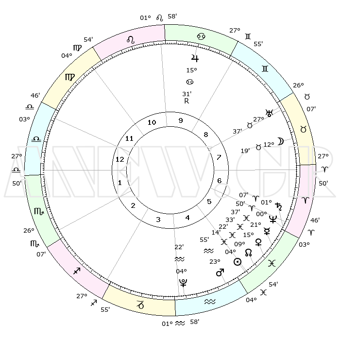 | | ΘΕΣΕΙΣ ΠΛΑΝΗΤΩΝ ΑΣΤΡΟΛΟΓΙΚΟΥ ΧΑΡΤΗ ΤΗΣ ΣΤΙΓΜΗΣ ΑΥΤΗΣ | | | | Πλανήτης | Ζώδιο | Μοίρες | Δεκαήμ. | Σε οίκο | Απόκλιση | | Ακμές των οίκων | | Ηλιος | Ιχθείς | 04°09' | Πρώτο | 5 | 09 S 59 | | 1ος | 03°35' | Ζυγός | | Σελήνη | Ταύρος | 11°09' | Δεύτερο | 8 | 19 N 37 | | 2ος | 00°26' | Σκορπιός | | Ερμής | Ιχθείς | 21°34' | Τρίτο | 6 | 01 S 33 | | 3ος | 00°60' | Τοξότης | | Αφροδίτη | Ιχθείς | 15°27' | Δεύτερο | 6 | 07 S 03 | | 4ος | 04°02' | Αιγόκερως | | Αρης | Υδροχόος | 23°51' | Τρίτο | 5 | 14 S 36 | | 5ος | 06°58' | Υδροχόος | | Δίας | Καρκίνος | 15°31'R | Δεύτερο | 10 | 22 N 52 | | 6ος | 07°16' | Ιχθείς | | Κρόνος | Κριός | 01°06' | Πρώτο | 6 | 01 S 31 | | 7ος | 03°35' | Κριός | | Ουρανός | Ταύρος | 27°37' | Τρίτο | 8 | 19 N 27 | | 8ος | 00°26' | Ταύρος | | Ποσειδώνας | Κριός | 00°50' | Πρώτο | 6 | 00 S 52 | | 9ος | 00°60' | Δίδυμοι | | Πλούτωνας | Υδροχόος | 04°22' | Πρώτο | 4 | 22 S 54 | | 10ος | 04°02' | Καρκίνος | | Β. Δεσμός | Ιχθείς | 09°23' | Πρώτο | 6 | 08 S 03 | | 11ος | 06°58' | Λέων | | Ωροσκόπος | Ζυγός | 03°35' | Πρώτο | | | 12ος | 07°16' | Παρθένος | | Μεσουράνημα | Καρκίνος | 04°02' | Πρώτο | | | |