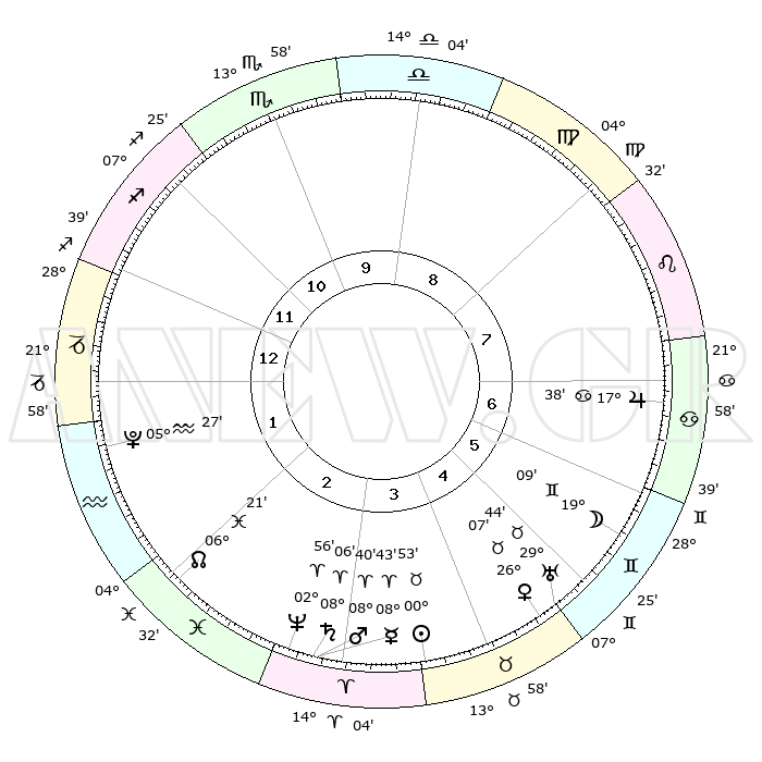 | | ΘΕΣΕΙΣ ΠΛΑΝΗΤΩΝ ΑΣΤΡΟΛΟΓΙΚΟΥ ΧΑΡΤΗ ΤΗΣ ΣΤΙΓΜΗΣ ΑΥΤΗΣ | | | | Πλανήτης | Ζώδιο | Μοίρες | Δεκαήμ. | Σε οίκο | Απόκλιση | | Ακμές των οίκων | | Ηλιος | Κριός | 29°56' | Τρίτο | 3 | 11 N 27 | | 1ος | 00°33' | Υδροχόος | | Σελήνη | Δίδυμοι | 04°40' | Πρώτο | 4 | 26 N 04 | | 2ος | 14°45' | Ιχθείς | | Ερμής | Κριός | 07°11' | Πρώτο | 2 | 00 N 27 | | 3ος | 23°06' | Κριός | | Αφροδίτη | Ταύρος | 24°55' | Τρίτο | 4 | 19 N 23 | | 4ος | 21°28' | Ταύρος | | Αρης | Κριός | 07°55' | Πρώτο | 2 | 02 N 15 | | 5ος | 14°12' | Δίδυμοι | | Δίας | Καρκίνος | 17°31' | Δεύτερο | 6 | 22 N 40 | | 6ος | 05°38' | Καρκίνος | | Κρόνος | Κριός | 07°59' | Πρώτο | 2 | 01 N 11 | | 7ος | 00°33' | Λέων | | Ουρανός | Ταύρος | 29°41' | Τρίτο | 4 | 19 N 55 | | 8ος | 14°45' | Παρθένος | | Ποσειδώνας | Κριός | 02°54' | Πρώτο | 2 | 00 S 03 | | 9ος | 23°06' | Ζυγός | | Πλούτωνας | Υδροχόος | 05°27' | Πρώτο | 1 | 22 S 48 | | 10ος | 21°28' | Σκορπιός | | Β. Δεσμός | Ιχθείς | 06°24' | Πρώτο | 1 | 09 S 10 | | 11ος | 14°12' | Τοξότης | | Ωροσκόπος | Υδροχόος | 00°33' | Πρώτο | | | 12ος | 05°38' | Αιγόκερως | | Μεσουράνημα | Σκορπιός | 21°28' | Τρίτο | | | |