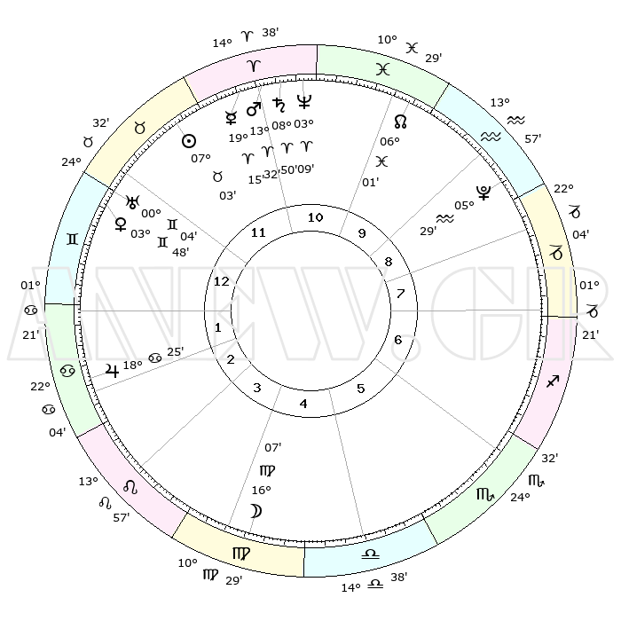 | | ΘΕΣΕΙΣ ΠΛΑΝΗΤΩΝ ΑΣΤΡΟΛΟΓΙΚΟΥ ΧΑΡΤΗ ΤΗΣ ΣΤΙΓΜΗΣ ΑΥΤΗΣ | | | | Πλανήτης | Ζώδιο | Μοίρες | Δεκαήμ. | Σε οίκο | Απόκλιση | | Ακμές των οίκων | | Ηλιος | Ταύρος | 06°59' | Πρώτο | 12 | 13 N 51 | | 1ος | 10°41' | Δίδυμοι | | Σελήνη | Παρθένος | 15°22' | Δεύτερο | 4 | 05 N 06 | | 2ος | 03°34' | Καρκίνος | | Ερμής | Κριός | 19°09' | Δεύτερο | 11 | 05 N 23 | | 3ος | 24°47' | Καρκίνος | | Αφροδίτη | Δίδυμοι | 03°44' | Πρώτο | 12 | 21 N 37 | | 4ος | 18°30' | Λέων | | Αρης | Κριός | 13°29' | Δεύτερο | 11 | 04 N 29 | | 5ος | 18°54' | Παρθένος | | Δίας | Καρκίνος | 18°24' | Δεύτερο | 2 | 22 N 33 | | 6ος | 28°42' | Ζυγός | | Κρόνος | Κριός | 08°50' | Πρώτο | 11 | 01 N 31 | | 7ος | 10°41' | Τοξότης | | Ουρανός | Δίδυμοι | 00°04' | Πρώτο | 12 | 20 N 00 | | 8ος | 03°34' | Αιγόκερως | | Ποσειδώνας | Κριός | 03°09' | Πρώτο | 11 | 00 N 02 | | 9ος | 24°47' | Αιγόκερως | | Πλούτωνας | Υδροχόος | 05°29' | Πρώτο | 9 | 22 S 48 | | 10ος | 18°30' | Υδροχόος | | Β. Δεσμός | Ιχθείς | 06°01' | Πρώτο | 10 | 09 S 18 | | 11ος | 18°54' | Ιχθείς | | Ωροσκόπος | Δίδυμοι | 10°41' | Δεύτερο | | | 12ος | 28°42' | Κριός | | Μεσουράνημα | Υδροχόος | 18°30' | Δεύτερο | | | |