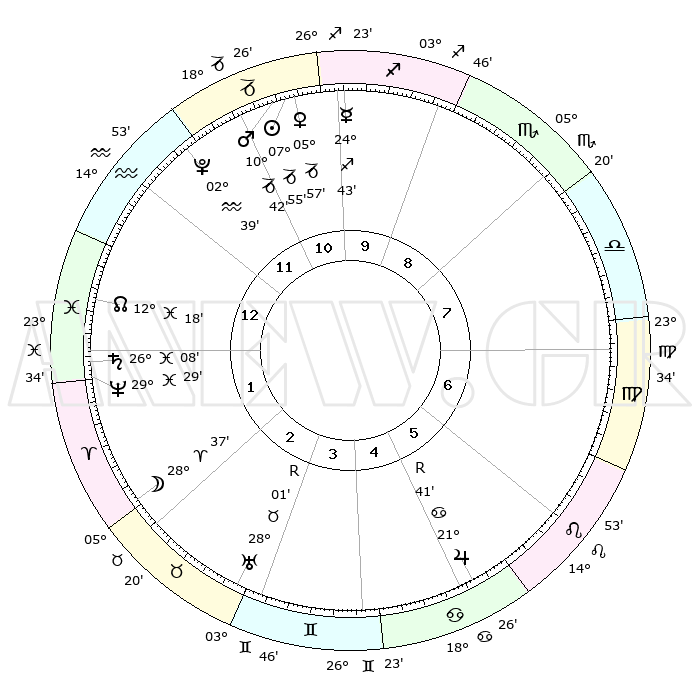 | | ΘΕΣΕΙΣ ΠΛΑΝΗΤΩΝ ΑΣΤΡΟΛΟΓΙΚΟΥ ΧΑΡΤΗ ΤΗΣ ΣΤΙΓΜΗΣ ΑΥΤΗΣ | | | | Πλανήτης | Ζώδιο | Μοίρες | Δεκαήμ. | Σε οίκο | Απόκλιση | | Ακμές των οίκων | | Ηλιος | Αιγόκερως | 07°51' | Πρώτο | 11 | 23 S 12 | | 1ος | 15°40' | Υδροχόος | | Σελήνη | Κριός | 27°37' | Τρίτο | 2 | 14 N 03 | | 2ος | 01°23' | Κριός | | Ερμής | Τοξότης | 24°37' | Τρίτο | 10 | 23 S 35 | | 3ος | 06°58' | Ταύρος | | Αφροδίτη | Αιγόκερως | 05°52' | Πρώτο | 11 | 23 S 42 | | 4ος | 03°02' | Δίδυμοι | | Αρης | Αιγόκερως | 10°39' | Δεύτερο | 11 | 23 S 53 | | 5ος | 24°59' | Δίδυμοι | | Δίας | Καρκίνος | 21°42'R | Τρίτο | 6 | 21 N 55 | | 6ος | 17°16' | Καρκίνος | | Κρόνος | Ιχθείς | 26°08' | Τρίτο | 1 | 03 S 37 | | 7ος | 15°40' | Λέων | | Ουρανός | Ταύρος | 28°01'R | Τρίτο | 3 | 19 N 31 | | 8ος | 01°23' | Ζυγός | | Ποσειδώνας | Ιχθείς | 29°29' | Τρίτο | 1 | 01 S 26 | | 9ος | 06°58' | Σκορπιός | | Πλούτωνας | Υδροχόος | 02°39' | Πρώτο | 12 | 23 S 14 | | 10ος | 03°02' | Τοξότης | | Β. Δεσμός | Ιχθείς | 12°19' | Δεύτερο | 1 | 06 S 56 | | 11ος | 24°59' | Τοξότης | | Ωροσκόπος | Υδροχόος | 15°40' | Δεύτερο | | | 12ος | 17°16' | Αιγόκερως | | Μεσουράνημα | Τοξότης | 03°02' | Πρώτο | | | |