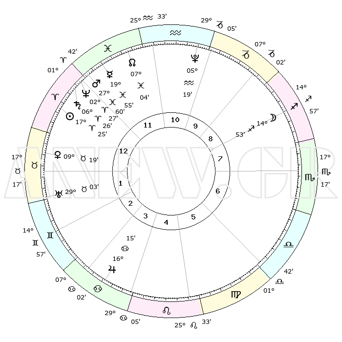 | | ΘΕΣΕΙΣ ΠΛΑΝΗΤΩΝ ΑΣΤΡΟΛΟΓΙΚΟΥ ΧΑΡΤΗ ΤΗΣ ΣΤΙΓΜΗΣ ΑΥΤΗΣ | | | | Πλανήτης | Ζώδιο | Μοίρες | Δεκαήμ. | Σε οίκο | Απόκλιση | | Ακμές των οίκων | | Ηλιος | Κριός | 17°22' | Δεύτερο | 12 | 06 N 49 | | 1ος | 18°03' | Κριός | | Σελήνη | Τοξότης | 14°13' | Δεύτερο | 8 | 27 S 36 | | 2ος | 23°36' | Ταύρος | | Ερμής | Ιχθείς | 19°51' | Δεύτερο | 12 | 05 S 57 | | 3ος | 18°30' | Δίδυμοι | | Αφροδίτη | Ταύρος | 09°14' | Πρώτο | 1 | 14 N 24 | | 4ος | 10°16' | Καρκίνος | | Αρης | Ιχθείς | 27°57' | Τρίτο | 12 | 01 S 45 | | 5ος | 03°38' | Λέων | | Δίας | Καρκίνος | 16°14' | Δεύτερο | 4 | 22 N 49 | | 6ος | 04°04' | Παρθένος | | Κρόνος | Κριός | 06°26' | Πρώτο | 12 | 00 N 35 | | 7ος | 18°03' | Ζυγός | | Ουρανός | Ταύρος | 29°03' | Τρίτο | 2 | 19 N 46 | | 8ος | 23°36' | Σκορπιός | | Ποσειδώνας | Κριός | 02°26' | Πρώτο | 12 | 00 S 14 | | 9ος | 18°30' | Τοξότης | | Πλούτωνας | Υδροχόος | 05°19' | Πρώτο | 11 | 22 S 47 | | 10ος | 10°16' | Αιγόκερως | | Β. Δεσμός | Ιχθείς | 07°05' | Πρώτο | 12 | 08 S 55 | | 11ος | 03°38' | Υδροχόος | | Ωροσκόπος | Κριός | 18°03' | Δεύτερο | | | 12ος | 04°04' | Ιχθείς | | Μεσουράνημα | Αιγόκερως | 10°16' | Δεύτερο | | | |