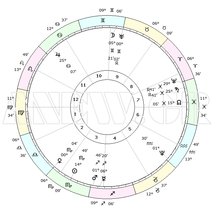 | | ΘΕΣΕΙΣ ΠΛΑΝΗΤΩΝ ΑΣΤΡΟΛΟΓΙΚΟΥ ΧΑΡΤΗ ΤΗΣ ΣΤΙΓΜΗΣ ΑΥΤΗΣ | | | | Πλανήτης | Ζώδιο | Μοίρες | Δεκαήμ. | Σε οίκο | Απόκλιση | | Ακμές των οίκων | | Ηλιος | Σκορπιός | 14°44' | Δεύτερο | 4 | 16 S 15 | | 1ος | 14°54' | Λέων | | Σελήνη | Δίδυμοι | 03°57' | Πρώτο | 10 | 25 N 47 | | 2ος | 07°12' | Παρθένος | | Ερμής | Τοξότης | 06°18' | Πρώτο | 4 | 24 S 00 | | 3ος | 04°14' | Ζυγός | | Αφροδίτη | Ζυγός | 29°57' | Τρίτο | 3 | 10 S 09 | | 4ος | 06°39' | Σκορπιός | | Αρης | Τοξότης | 01°42' | Πρώτο | 4 | 20 S 56 | | 5ος | 11°56' | Τοξότης | | Δίας | Καρκίνος | 25°07' | Τρίτο | 12 | 21 N 12 | | 6ος | 15°25' | Αιγόκερως | | Κρόνος | Ιχθείς | 25°41'R | Τρίτο | 8 | 03 S 58 | | 7ος | 14°54' | Υδροχόος | | Ουρανός | Δίδυμοι | 00°03'R | Πρώτο | 10 | 19 N 57 | | 8ος | 07°12' | Ιχθείς | | Ποσειδώνας | Ιχθείς | 29°41'R | Τρίτο | 8 | 01 S 23 | | 9ος | 04°14' | Κριός | | Πλούτωνας | Υδροχόος | 01°30' | Πρώτο | 6 | 23 S 30 | | 10ος | 06°39' | Ταύρος | | Β. Δεσμός | Ιχθείς | 15°05' | Δεύτερο | 8 | 05 S 52 | | 11ος | 11°55' | Δίδυμοι | | Ωροσκόπος | Λέων | 14°54' | Δεύτερο | | | 12ος | 15°25' | Καρκίνος | | Μεσουράνημα | Ταύρος | 06°39' | Πρώτο | | | |