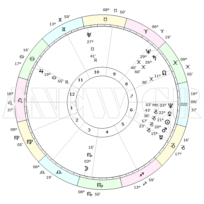 | | ΘΕΣΕΙΣ ΠΛΑΝΗΤΩΝ ΑΣΤΡΟΛΟΓΙΚΟΥ ΧΑΡΤΗ ΤΗΣ ΣΤΙΓΜΗΣ ΑΥΤΗΣ | | | | Πλανήτης | Ζώδιο | Μοίρες | Δεκαήμ. | Σε οίκο | Απόκλιση | | Ακμές των οίκων | | Ηλιος | Αιγόκερως | 21°11' | Τρίτο | 10 | 21 S 46 | | 1ος | 19°58' | Κριός | | Σελήνη | Ζυγός | 29°28' | Τρίτο | 7 | 14 S 54 | | 2ος | 24°59' | Ταύρος | | Ερμής | Αιγόκερως | 14°53' | Δεύτερο | 10 | 24 S 08 | | 3ος | 19°39' | Δίδυμοι | | Αφροδίτη | Αιγόκερως | 22°19' | Τρίτο | 10 | 22 S 27 | | 4ος | 11°23' | Καρκίνος | | Αρης | Αιγόκερως | 20°43' | Τρίτο | 10 | 22 S 47 | | 5ος | 04°54' | Λέων | | Δίας | Καρκίνος | 19°58'R | Δεύτερο | 4 | 22 N 13 | | 6ος | 05°42' | Παρθένος | | Κρόνος | Ιχθείς | 26°58' | Τρίτο | 12 | 03 S 15 | | 7ος | 19°58' | Ζυγός | | Ουρανός | Ταύρος | 27°42'R | Τρίτο | 2 | 19 N 27 | | 8ος | 24°59' | Σκορπιός | | Ποσειδώνας | Ιχθείς | 29°40' | Τρίτο | 12 | 01 S 21 | | 9ος | 19°39' | Τοξότης | | Πλούτωνας | Υδροχόος | 03°03' | Πρώτο | 10 | 23 S 09 | | 10ος | 11°23' | Αιγόκερως | | Β. Δεσμός | Ιχθείς | 11°37' | Δεύτερο | 12 | 07 S 12 | | 11ος | 04°54' | Υδροχόος | | Ωροσκόπος | Κριός | 19°58' | Δεύτερο | | | 12ος | 05°42' | Ιχθείς | | Μεσουράνημα | Αιγόκερως | 11°23' | Δεύτερο | | | |