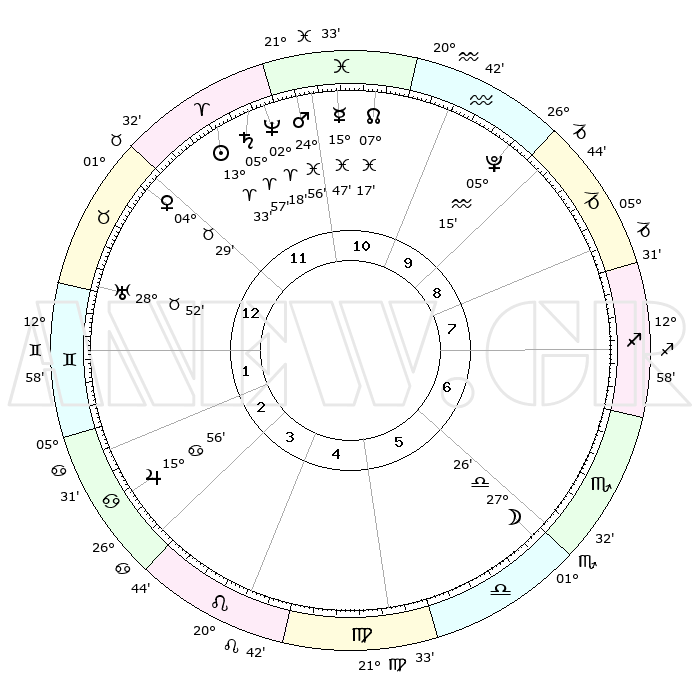 | | ΘΕΣΕΙΣ ΠΛΑΝΗΤΩΝ ΑΣΤΡΟΛΟΓΙΚΟΥ ΧΑΡΤΗ ΤΗΣ ΣΤΙΓΜΗΣ ΑΥΤΗΣ | | | | Πλανήτης | Ζώδιο | Μοίρες | Δεκαήμ. | Σε οίκο | Απόκλιση | | Ακμές των οίκων | | Ηλιος | Κριός | 13°29' | Δεύτερο | 12 | 05 N 19 | | 1ος | 11°17' | Ταύρος | | Σελήνη | Ζυγός | 26°32' | Τρίτο | 6 | 13 S 49 | | 2ος | 10°28' | Δίδυμοι | | Ερμής | Ιχθείς | 15°43' | Δεύτερο | 11 | 07 S 08 | | 3ος | 02°59' | Καρκίνος | | Αφροδίτη | Ταύρος | 04°23' | Πρώτο | 12 | 12 N 39 | | 4ος | 24°51' | Καρκίνος | | Αρης | Ιχθείς | 24°52' | Τρίτο | 11 | 02 S 59 | | 5ος | 20°30' | Λέων | | Δίας | Καρκίνος | 15°56' | Δεύτερο | 3 | 22 N 51 | | 6ος | 25°29' | Παρθένος | | Κρόνος | Κριός | 05°56' | Πρώτο | 12 | 00 N 24 | | 7ος | 11°17' | Σκορπιός | | Ουρανός | Ταύρος | 28°52' | Τρίτο | 1 | 19 N 44 | | 8ος | 10°28' | Τοξότης | | Ποσειδώνας | Κριός | 02°18' | Πρώτο | 12 | 00 S 17 | | 9ος | 02°59' | Αιγόκερως | | Πλούτωνας | Υδροχόος | 05°15' | Πρώτο | 10 | 22 S 47 | | 10ος | 24°51' | Αιγόκερως | | Β. Δεσμός | Ιχθείς | 07°17' | Πρώτο | 11 | 08 S 50 | | 11ος | 20°30' | Υδροχόος | | Ωροσκόπος | Ταύρος | 11°17' | Δεύτερο | | | 12ος | 25°29' | Ιχθείς | | Μεσουράνημα | Αιγόκερως | 24°51' | Τρίτο | | | |