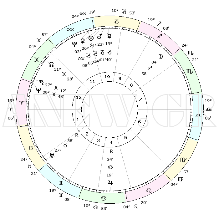 | | ΘΕΣΕΙΣ ΠΛΑΝΗΤΩΝ ΑΣΤΡΟΛΟΓΙΚΟΥ ΧΑΡΤΗ ΤΗΣ ΣΤΙΓΜΗΣ ΑΥΤΗΣ | | | | Πλανήτης | Ζώδιο | Μοίρες | Δεκαήμ. | Σε οίκο | Απόκλιση | | Ακμές των οίκων | | Ηλιος | Αιγόκερως | 24°09' | Τρίτο | 11 | 21 S 16 | | 1ος | 07°55' | Ιχθείς | | Σελήνη | Τοξότης | 04°07' | Πρώτο | 9 | 25 S 58 | | 2ος | 22°29' | Κριός | | Ερμής | Αιγόκερως | 19°34' | Δεύτερο | 11 | 23 S 44 | | 3ος | 23°40' | Ταύρος | | Αφροδίτη | Αιγόκερως | 25°59' | Τρίτο | 11 | 21 S 53 | | 4ος | 17°21' | Δίδυμοι | | Αρης | Αιγόκερως | 22°58' | Τρίτο | 11 | 22 S 26 | | 5ος | 09°04' | Καρκίνος | | Δίας | Καρκίνος | 19°34'R | Δεύτερο | 5 | 22 N 16 | | 6ος | 03°29' | Λέων | | Κρόνος | Ιχθείς | 27°12' | Τρίτο | 1 | 03 S 09 | | 7ος | 07°55' | Παρθένος | | Ουρανός | Ταύρος | 27°39'R | Τρίτο | 3 | 19 N 26 | | 8ος | 22°29' | Ζυγός | | Ποσειδώνας | Ιχθείς | 29°43' | Τρίτο | 1 | 01 S 20 | | 9ος | 23°40' | Σκορπιός | | Πλούτωνας | Υδροχόος | 03°08' | Πρώτο | 11 | 23 S 08 | | 10ος | 17°21' | Τοξότης | | Β. Δεσμός | Ιχθείς | 11°28' | Δεύτερο | 1 | 07 S 16 | | 11ος | 09°04' | Αιγόκερως | | Ωροσκόπος | Ιχθείς | 07°55' | Πρώτο | | | 12ος | 03°29' | Υδροχόος | | Μεσουράνημα | Τοξότης | 17°21' | Δεύτερο | | | |