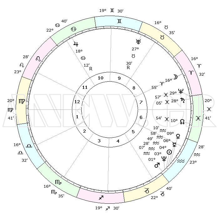 | | ΘΕΣΕΙΣ ΠΛΑΝΗΤΩΝ ΑΣΤΡΟΛΟΓΙΚΟΥ ΧΑΡΤΗ ΤΗΣ ΣΤΙΓΜΗΣ ΑΥΤΗΣ | | | | Πλανήτης | Ζώδιο | Μοίρες | Δεκαήμ. | Σε οίκο | Απόκλιση | | Ακμές των οίκων | | Ηλιος | Υδροχόος | 04°45' | Πρώτο | 6 | 19 S 04 | | 1ος | 28°55' | Λέων | | Σελήνη | Κριός | 15°54' | Δεύτερο | 8 | 09 N 07 | | 2ος | 22°40' | Παρθένος | | Ερμής | Υδροχόος | 06°50' | Πρώτο | 6 | 20 S 35 | | 3ος | 21°14' | Ζυγός | | Αφροδίτη | Υδροχόος | 09°04' | Πρώτο | 6 | 19 S 10 | | 4ος | 24°08' | Σκορπιός | | Αρης | Υδροχόος | 01°04' | Πρώτο | 6 | 20 S 54 | | 5ος | 28°24' | Τοξότης | | Δίας | Καρκίνος | 18°13'R | Δεύτερο | 11 | 22 N 29 | | 6ος | 00°27' | Υδροχόος | | Κρόνος | Ιχθείς | 28°04' | Τρίτο | 8 | 02 S 47 | | 7ος | 28°55' | Υδροχόος | | Ουρανός | Ταύρος | 27°30'R | Τρίτο | 10 | 19 N 25 | | 8ος | 22°40' | Ιχθείς | | Ποσειδώνας | Ιχθείς | 29°57' | Τρίτο | 8 | 01 S 14 | | 9ος | 21°14' | Κριός | | Πλούτωνας | Υδροχόος | 03°28' | Πρώτο | 6 | 23 S 04 | | 10ος | 24°08' | Ταύρος | | Β. Δεσμός | Ιχθείς | 10°55' | Δεύτερο | 7 | 07 S 28 | | 11ος | 28°24' | Δίδυμοι | | Ωροσκόπος | Λέων | 28°55' | Τρίτο | | | 12ος | 00°27' | Λέων | | Μεσουράνημα | Ταύρος | 24°08' | Τρίτο | | | |