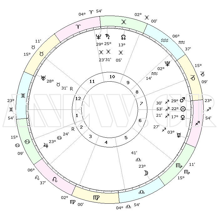 | | ΘΕΣΕΙΣ ΠΛΑΝΗΤΩΝ ΑΣΤΡΟΛΟΓΙΚΟΥ ΧΑΡΤΗ ΤΗΣ ΣΤΙΓΜΗΣ ΑΥΤΗΣ | | | | Πλανήτης | Ζώδιο | Μοίρες | Δεκαήμ. | Σε οίκο | Απόκλιση | | Ακμές των οίκων | | Ηλιος | Τοξότης | 22°36' | Τρίτο | 11 | 23 S 14 | | 1ος | 09°44' | Υδροχόος | | Σελήνη | Ζυγός | 20°27' | Τρίτο | 8 | 10 S 49 | | 2ος | 25°05' | Ιχθείς | | Ερμής | Τοξότης | 03°05' | Πρώτο | 10 | 19 S 11 | | 3ος | 01°49' | Ταύρος | | Αφροδίτη | Τοξότης | 17°01' | Δεύτερο | 10 | 22 S 37 | | 4ος | 28°43' | Ταύρος | | Αρης | Τοξότης | 29°17' | Τρίτο | 11 | 24 S 12 | | 5ος | 20°54' | Δίδυμοι | | Δίας | Καρκίνος | 23°26'R | Τρίτο | 6 | 21 N 35 | | 6ος | 12°47' | Καρκίνος | | Κρόνος | Ιχθείς | 25°31' | Τρίτο | 2 | 03 S 55 | | 7ος | 09°44' | Λέων | | Ουρανός | Ταύρος | 28°31'R | Τρίτο | 3 | 19 N 38 | | 8ος | 25°05' | Παρθένος | | Ποσειδώνας | Ιχθείς | 29°23' | Τρίτο | 2 | 01 S 29 | | 9ος | 01°49' | Σκορπιός | | Πλούτωνας | Υδροχόος | 02°13' | Πρώτο | 12 | 23 S 20 | | 10ος | 28°43' | Σκορπιός | | Β. Δεσμός | Ιχθείς | 13°06' | Δεύτερο | 1 | 06 S 38 | | 11ος | 20°54' | Τοξότης | | Ωροσκόπος | Υδροχόος | 09°44' | Πρώτο | | | 12ος | 12°47' | Αιγόκερως | | Μεσουράνημα | Σκορπιός | 28°43' | Τρίτο | | | |