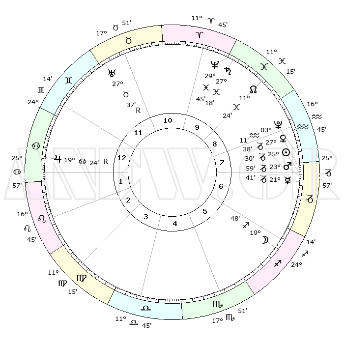 | | ΘΕΣΕΙΣ ΠΛΑΝΗΤΩΝ ΑΣΤΡΟΛΟΓΙΚΟΥ ΧΑΡΤΗ ΤΗΣ ΣΤΙΓΜΗΣ ΑΥΤΗΣ | | | | Πλανήτης | Ζώδιο | Μοίρες | Δεκαήμ. | Σε οίκο | Απόκλιση | | Ακμές των οίκων | | Ηλιος | Αιγόκερως | 25°25' | Τρίτο | 8 | 21 S 03 | | 1ος | 04°03' | Καρκίνος | | Σελήνη | Τοξότης | 18°56' | Δεύτερο | 6 | 28 S 01 | | 2ος | 24°38' | Καρκίνος | | Ερμής | Αιγόκερως | 21°34' | Τρίτο | 7 | 23 S 30 | | 3ος | 16°44' | Λέων | | Αφροδίτη | Αιγόκερως | 27°33' | Τρίτο | 8 | 21 S 37 | | 4ος | 13°42' | Παρθένος | | Αρης | Αιγόκερως | 23°56' | Τρίτο | 7 | 22 S 16 | | 5ος | 18°15' | Ζυγός | | Δίας | Καρκίνος | 19°24'R | Δεύτερο | 1 | 22 N 18 | | 6ος | 27°54' | Σκορπιός | | Κρόνος | Ιχθείς | 27°17' | Τρίτο | 10 | 03 S 07 | | 7ος | 04°03' | Αιγόκερως | | Ουρανός | Ταύρος | 27°37'R | Τρίτο | 11 | 19 N 26 | | 8ος | 24°38' | Αιγόκερως | | Ποσειδώνας | Ιχθείς | 29°45' | Τρίτο | 10 | 01 S 19 | | 9ος | 16°44' | Υδροχόος | | Πλούτωνας | Υδροχόος | 03°11' | Πρώτο | 8 | 23 S 08 | | 10ος | 13°42' | Ιχθείς | | Β. Δεσμός | Ιχθείς | 11°24' | Δεύτερο | 9 | 07 S 17 | | 11ος | 18°15' | Κριός | | Ωροσκόπος | Καρκίνος | 04°03' | Πρώτο | | | 12ος | 27°54' | Ταύρος | | Μεσουράνημα | Ιχθείς | 13°42' | Δεύτερο | | | |