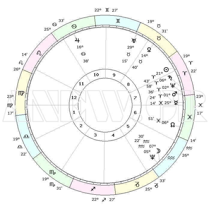 | | ΘΕΣΕΙΣ ΠΛΑΝΗΤΩΝ ΑΣΤΡΟΛΟΓΙΚΟΥ ΧΑΡΤΗ ΤΗΣ ΣΤΙΓΜΗΣ ΑΥΤΗΣ | | | | Πλανήτης | Ζώδιο | Μοίρες | Δεκαήμ. | Σε οίκο | Απόκλιση | | Ακμές των οίκων | | Ηλιος | Κριός | 21°40' | Τρίτο | 8 | 08 N 26 | | 1ος | 04°56' | Παρθένος | | Σελήνη | Υδροχόος | 06°44' | Πρώτο | 5 | 21 S 12 | | 2ος | 29°18' | Παρθένος | | Ερμής | Ιχθείς | 25°09' | Τρίτο | 7 | 04 S 10 | | 3ος | 28°24' | Ζυγός | | Αφροδίτη | Ταύρος | 14°36' | Δεύτερο | 9 | 16 N 14 | | 4ος | 01°21' | Τοξότης | | Αρης | Κριός | 01°21' | Πρώτο | 8 | 00 S 23 | | 5ος | 05°13' | Αιγόκερως | | Δίας | Καρκίνος | 16°37' | Δεύτερο | 11 | 22 N 46 | | 6ος | 06°49' | Υδροχόος | | Κρόνος | Κριός | 06°58' | Πρώτο | 8 | 00 N 48 | | 7ος | 04°56' | Ιχθείς | | Ουρανός | Ταύρος | 29°15' | Τρίτο | 9 | 19 N 49 | | 8ος | 29°18' | Ιχθείς | | Ποσειδώνας | Κριός | 02°36' | Πρώτο | 8 | 00 S 10 | | 9ος | 28°24' | Κριός | | Πλούτωνας | Υδροχόος | 05°22' | Πρώτο | 5 | 22 S 47 | | 10ος | 01°21' | Δίδυμοι | | Β. Δεσμός | Ιχθείς | 06°51' | Πρώτο | 7 | 09 S 00 | | 11ος | 05°13' | Καρκίνος | | Ωροσκόπος | Παρθένος | 04°56' | Πρώτο | | | 12ος | 06°49' | Λέων | | Μεσουράνημα | Δίδυμοι | 01°21' | Πρώτο | | | |