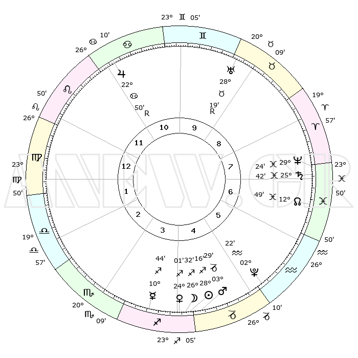 | | ΘΕΣΕΙΣ ΠΛΑΝΗΤΩΝ ΑΣΤΡΟΛΟΓΙΚΟΥ ΧΑΡΤΗ ΤΗΣ ΣΤΙΓΜΗΣ ΑΥΤΗΣ | | | | Πλανήτης | Ζώδιο | Μοίρες | Δεκαήμ. | Σε οίκο | Απόκλιση | | Ακμές των οίκων | | Ηλιος | Τοξότης | 28°11' | Τρίτο | 4 | 23 S 25 | | 1ος | 00°38' | Παρθένος | | Σελήνη | Τοξότης | 25°35' | Τρίτο | 4 | 28 S 13 | | 2ος | 24°33' | Παρθένος | | Ερμής | Τοξότης | 10°38' | Δεύτερο | 4 | 21 S 08 | | 3ος | 23°17' | Ζυγός | | Αφροδίτη | Τοξότης | 23°55' | Τρίτο | 4 | 23 S 19 | | 4ος | 26°12' | Σκορπιός | | Αρης | Αιγόκερως | 03°26' | Πρώτο | 5 | 24 S 12 | | 5ος | 00°21' | Αιγόκερως | | Δίας | Καρκίνος | 22°51'R | Τρίτο | 11 | 21 N 42 | | 6ος | 02°15' | Υδροχόος | | Κρόνος | Ιχθείς | 25°42' | Τρίτο | 8 | 03 S 49 | | 7ος | 00°38' | Ιχθείς | | Ουρανός | Ταύρος | 28°19'R | Τρίτο | 10 | 19 N 35 | | 8ος | 24°33' | Ιχθείς | | Ποσειδώνας | Ιχθείς | 29°24' | Τρίτο | 8 | 01 S 28 | | 9ος | 23°17' | Κριός | | Πλούτωνας | Υδροχόος | 02°22' | Πρώτο | 6 | 23 S 18 | | 10ος | 26°12' | Ταύρος | | Β. Δεσμός | Ιχθείς | 12°49' | Δεύτερο | 7 | 06 S 45 | | 11ος | 00°21' | Καρκίνος | | Ωροσκόπος | Παρθένος | 00°38' | Πρώτο | | | 12ος | 02°15' | Λέων | | Μεσουράνημα | Ταύρος | 26°12' | Τρίτο | | | |