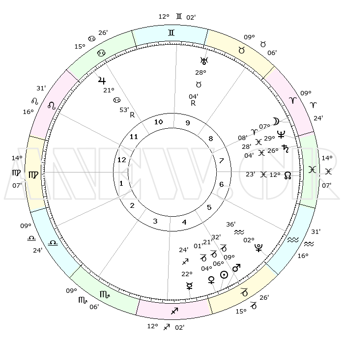 | | ΘΕΣΕΙΣ ΠΛΑΝΗΤΩΝ ΑΣΤΡΟΛΟΓΙΚΟΥ ΧΑΡΤΗ ΤΗΣ ΣΤΙΓΜΗΣ ΑΥΤΗΣ | | | | Πλανήτης | Ζώδιο | Μοίρες | Δεκαήμ. | Σε οίκο | Απόκλιση | | Ακμές των οίκων | | Ηλιος | Αιγόκερως | 06°17' | Πρώτο | 5 | 23 S 17 | | 1ος | 23°27' | Λέων | | Σελήνη | Κριός | 06°10' | Πρώτο | 8 | 04 N 25 | | 2ος | 16°37' | Παρθένος | | Ερμής | Τοξότης | 22°18' | Τρίτο | 5 | 23 S 18 | | 3ος | 14°39' | Ζυγός | | Αφροδίτη | Αιγόκερως | 03°55' | Πρώτο | 5 | 23 S 43 | | 4ος | 17°26' | Σκορπιός | | Αρης | Αιγόκερως | 09°29' | Πρώτο | 5 | 23 S 57 | | 5ος | 22°06' | Τοξότης | | Δίας | Καρκίνος | 21°54'R | Τρίτο | 11 | 21 N 53 | | 6ος | 24°38' | Αιγόκερως | | Κρόνος | Ιχθείς | 26°03' | Τρίτο | 8 | 03 S 39 | | 7ος | 23°27' | Υδροχόος | | Ουρανός | Ταύρος | 28°04'R | Τρίτο | 10 | 19 N 32 | | 8ος | 16°37' | Ιχθείς | | Ποσειδώνας | Ιχθείς | 29°28' | Τρίτο | 8 | 01 S 26 | | 9ος | 14°39' | Κριός | | Πλούτωνας | Υδροχόος | 02°36' | Πρώτο | 6 | 23 S 15 | | 10ος | 17°26' | Ταύρος | | Β. Δεσμός | Ιχθείς | 12°24' | Δεύτερο | 7 | 06 S 55 | | 11ος | 22°06' | Δίδυμοι | | Ωροσκόπος | Λέων | 23°27' | Τρίτο | | | 12ος | 24°38' | Καρκίνος | | Μεσουράνημα | Ταύρος | 17°26' | Δεύτερο | | | |