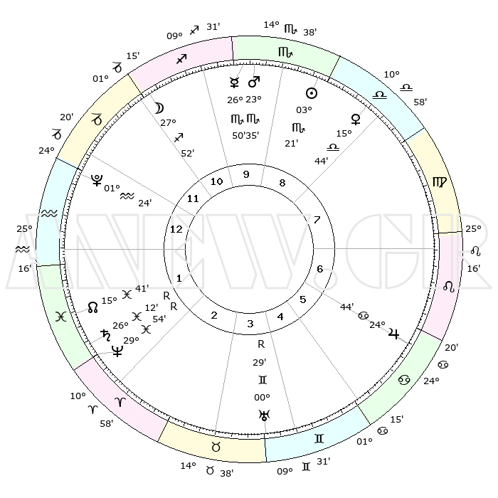 | | ΘΕΣΕΙΣ ΠΛΑΝΗΤΩΝ ΑΣΤΡΟΛΟΓΙΚΟΥ ΧΑΡΤΗ ΤΗΣ ΣΤΙΓΜΗΣ ΑΥΤΗΣ | | | | Πλανήτης | Ζώδιο | Μοίρες | Δεκαήμ. | Σε οίκο | Απόκλιση | | Ακμές των οίκων | | Ηλιος | Σκορπιός | 03°14' | Πρώτο | 10 | 12 S 35 | | 1ος | 07°33' | Αιγόκερως | | Σελήνη | Τοξότης | 26°31' | Τρίτο | 12 | 28 S 27 | | 2ος | 16°37' | Υδροχόος | | Ερμής | Σκορπιός | 26°43' | Τρίτο | 11 | 22 S 03 | | 3ος | 26°55' | Ιχθείς | | Αφροδίτη | Ζυγός | 15°36' | Δεύτερο | 9 | 04 S 44 | | 4ος | 29°34' | Κριός | | Αρης | Σκορπιός | 23°31' | Τρίτο | 10 | 18 S 58 | | 5ος | 24°44' | Ταύρος | | Δίας | Καρκίνος | 24°43' | Τρίτο | 7 | 21 N 15 | | 6ος | 16°09' | Δίδυμοι | | Κρόνος | Ιχθείς | 26°12'R | Τρίτο | 2 | 03 S 47 | | 7ος | 07°33' | Καρκίνος | | Ουρανός | Δίδυμοι | 00°29'R | Πρώτο | 5 | 20 N 02 | | 8ος | 16°37' | Λέων | | Ποσειδώνας | Ιχθείς | 29°54'R | Τρίτο | 3 | 01 S 18 | | 9ος | 26°55' | Παρθένος | | Πλούτωνας | Υδροχόος | 01°24' | Πρώτο | 1 | 23 S 31 | | 10ος | 29°34' | Ζυγός | | Β. Δεσμός | Ιχθείς | 15°42' | Δεύτερο | 2 | 05 S 38 | | 11ος | 24°44' | Σκορπιός | | Ωροσκόπος | Αιγόκερως | 07°33' | Πρώτο | | | 12ος | 16°09' | Τοξότης | | Μεσουράνημα | Ζυγός | 29°34' | Τρίτο | | | |