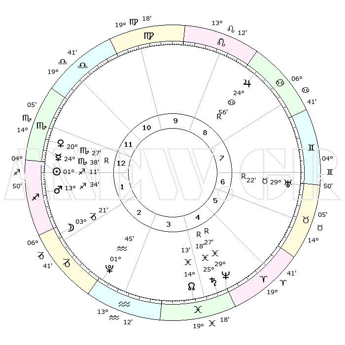 | | ΘΕΣΕΙΣ ΠΛΑΝΗΤΩΝ ΑΣΤΡΟΛΟΓΙΚΟΥ ΧΑΡΤΗ ΤΗΣ ΣΤΙΓΜΗΣ ΑΥΤΗΣ | | | | Πλανήτης | Ζώδιο | Μοίρες | Δεκαήμ. | Σε οίκο | Απόκλιση | | Ακμές των οίκων | | Ηλιος | Τοξότης | 01°07' | Πρώτο | 1 | 20 S 23 | | 1ος | 16°50' | Σκορπιός | | Σελήνη | Αιγόκερως | 02°37' | Πρώτο | 2 | 28 S 10 | | 2ος | 16°28' | Τοξότης | | Ερμής | Σκορπιός | 24°43'R | Τρίτο | 1 | 17 S 34 | | 3ος | 20°11' | Αιγόκερως | | Αφροδίτη | Σκορπιός | 20°22' | Τρίτο | 1 | 16 S 54 | | 4ος | 25°35' | Υδροχόος | | Αρης | Τοξότης | 13°32' | Δεύτερο | 1 | 23 S 01 | | 5ος | 27°54' | Ιχθείς | | Δίας | Καρκίνος | 24°56'R | Τρίτο | 9 | 21 N 16 | | 6ος | 24°42' | Κριός | | Κρόνος | Ιχθείς | 25°18'R | Τρίτο | 4 | 04 S 04 | | 7ος | 16°50' | Ταύρος | | Ουρανός | Ταύρος | 29°22'R | Τρίτο | 7 | 19 N 48 | | 8ος | 16°28' | Δίδυμοι | | Ποσειδώνας | Ιχθείς | 29°27'R | Τρίτο | 5 | 01 S 28 | | 9ος | 20°11' | Καρκίνος | | Πλούτωνας | Υδροχόος | 01°45' | Πρώτο | 3 | 23 S 26 | | 10ος | 25°35' | Λέων | | Β. Δεσμός | Ιχθείς | 14°14' | Δεύτερο | 4 | 06 S 12 | | 11ος | 27°54' | Παρθένος | | Ωροσκόπος | Σκορπιός | 16°50' | Δεύτερο | | | 12ος | 24°42' | Ζυγός | | Μεσουράνημα | Λέων | 25°35' | Τρίτο | | | |
