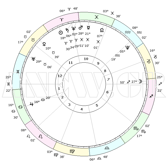 | | ΘΕΣΕΙΣ ΠΛΑΝΗΤΩΝ ΑΣΤΡΟΛΟΓΙΚΟΥ ΧΑΡΤΗ ΤΗΣ ΣΤΙΓΜΗΣ ΑΥΤΗΣ | | | | Πλανήτης | Ζώδιο | Μοίρες | Δεκαήμ. | Σε οίκο | Απόκλιση | | Ακμές των οίκων | | Ηλιος | Κριός | 18°26' | Δεύτερο | 11 | 07 N 14 | | 1ος | 03°51' | Δίδυμοι | | Σελήνη | Τοξότης | 27°09' | Τρίτο | 7 | 28 S 17 | | 2ος | 27°54' | Δίδυμοι | | Ερμής | Ιχθείς | 21°06' | Τρίτο | 11 | 05 S 33 | | 3ος | 19°13' | Καρκίνος | | Αφροδίτη | Ταύρος | 10°35' | Δεύτερο | 12 | 14 N 52 | | 4ος | 12°17' | Λέων | | Αρης | Ιχθείς | 28°48' | Τρίτο | 11 | 01 S 25 | | 5ος | 11°25' | Παρθένος | | Δίας | Καρκίνος | 16°20' | Δεύτερο | 2 | 22 N 48 | | 6ος | 20°26' | Ζυγός | | Κρόνος | Κριός | 06°34' | Πρώτο | 11 | 00 N 39 | | 7ος | 03°51' | Τοξότης | | Ουρανός | Ταύρος | 29°06' | Τρίτο | 12 | 19 N 47 | | 8ος | 27°54' | Τοξότης | | Ποσειδώνας | Κριός | 02°29' | Πρώτο | 11 | 00 S 13 | | 9ος | 19°13' | Αιγόκερως | | Πλούτωνας | Υδροχόος | 05°19' | Πρώτο | 9 | 22 S 47 | | 10ος | 12°17' | Υδροχόος | | Β. Δεσμός | Ιχθείς | 07°01' | Πρώτο | 10 | 08 S 56 | | 11ος | 11°25' | Ιχθείς | | Ωροσκόπος | Δίδυμοι | 03°51' | Πρώτο | | | 12ος | 20°26' | Κριός | | Μεσουράνημα | Υδροχόος | 12°17' | Δεύτερο | | | |