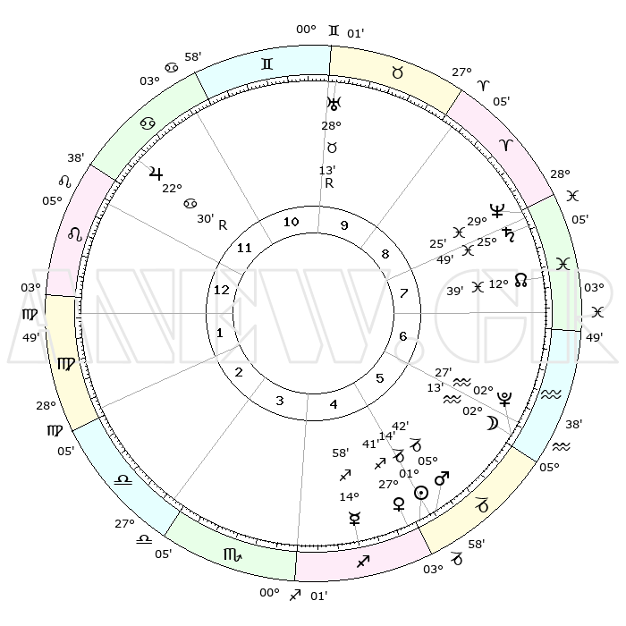 | | ΘΕΣΕΙΣ ΠΛΑΝΗΤΩΝ ΑΣΤΡΟΛΟΓΙΚΟΥ ΧΑΡΤΗ ΤΗΣ ΣΤΙΓΜΗΣ ΑΥΤΗΣ | | | | Πλανήτης | Ζώδιο | Μοίρες | Δεκαήμ. | Σε οίκο | Απόκλιση | | Ακμές των οίκων | | Ηλιος | Αιγόκερως | 01°09' | Πρώτο | 5 | 23 S 26 | | 1ος | 11°04' | Λέων | | Σελήνη | Υδροχόος | 01°15' | Πρώτο | 6 | 23 S 03 | | 2ος | 02°59' | Παρθένος | | Ερμής | Τοξότης | 14°51' | Δεύτερο | 5 | 22 S 02 | | 3ος | 29°32' | Παρθένος | | Αφροδίτη | Τοξότης | 27°35' | Τρίτο | 5 | 23 S 33 | | 4ος | 01°41' | Σκορπιός | | Αρης | Αιγόκερως | 05°39' | Πρώτο | 5 | 24 S 09 | | 5ος | 07°13' | Τοξότης | | Δίας | Καρκίνος | 22°30'R | Τρίτο | 12 | 21 N 46 | | 6ος | 11°13' | Αιγόκερως | | Κρόνος | Ιχθείς | 25°49' | Τρίτο | 8 | 03 S 46 | | 7ος | 11°04' | Υδροχόος | | Ουρανός | Ταύρος | 28°13'R | Τρίτο | 10 | 19 N 34 | | 8ος | 02°59' | Ιχθείς | | Ποσειδώνας | Ιχθείς | 29°25' | Τρίτο | 8 | 01 S 28 | | 9ος | 29°32' | Ιχθείς | | Πλούτωνας | Υδροχόος | 02°27' | Πρώτο | 6 | 23 S 17 | | 10ος | 01°41' | Ταύρος | | Β. Δεσμός | Ιχθείς | 12°39' | Δεύτερο | 8 | 06 S 48 | | 11ος | 07°13' | Δίδυμοι | | Ωροσκόπος | Λέων | 11°04' | Δεύτερο | | | 12ος | 11°13' | Καρκίνος | | Μεσουράνημα | Ταύρος | 01°41' | Πρώτο | | | |