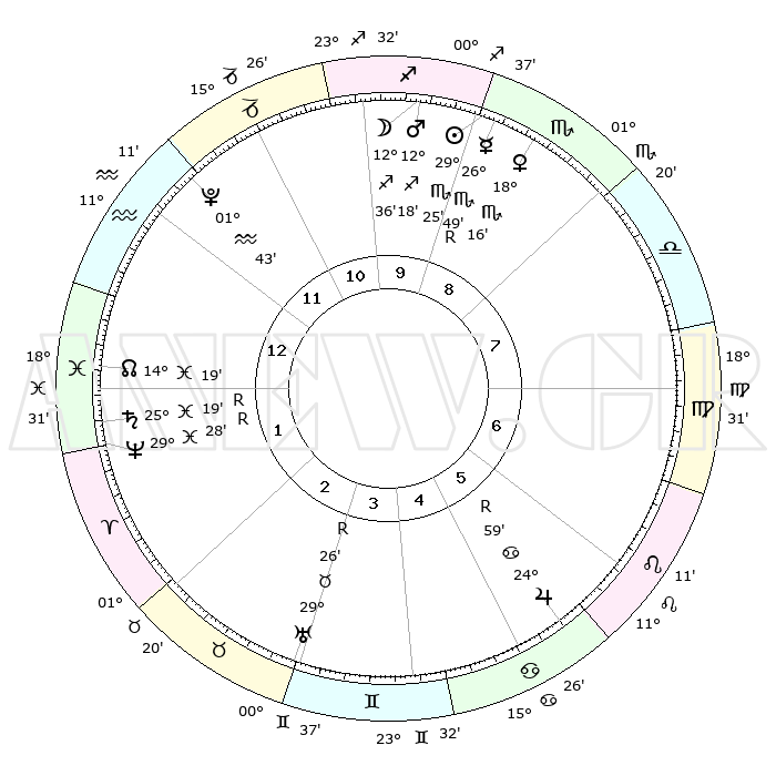 | | ΘΕΣΕΙΣ ΠΛΑΝΗΤΩΝ ΑΣΤΡΟΛΟΓΙΚΟΥ ΧΑΡΤΗ ΤΗΣ ΣΤΙΓΜΗΣ ΑΥΤΗΣ | | | | Πλανήτης | Ζώδιο | Μοίρες | Δεκαήμ. | Σε οίκο | Απόκλιση | | Ακμές των οίκων | | Ηλιος | Σκορπιός | 29°23' | Τρίτο | 9 | 20 S 01 | | 1ος | 23°32' | Υδροχόος | | Σελήνη | Τοξότης | 12°03' | Δεύτερο | 10 | 27 S 11 | | 2ος | 09°18' | Κριός | | Ερμής | Σκορπιός | 26°53'R | Τρίτο | 9 | 18 S 35 | | 3ος | 13°19' | Ταύρος | | Αφροδίτη | Σκορπιός | 18°12' | Δεύτερο | 9 | 16 S 16 | | 4ος | 08°24' | Δίδυμοι | | Αρης | Τοξότης | 12°16' | Δεύτερο | 10 | 22 S 50 | | 5ος | 00°09' | Καρκίνος | | Δίας | Καρκίνος | 24°59'R | Τρίτο | 6 | 21 N 16 | | 6ος | 23°05' | Καρκίνος | | Κρόνος | Ιχθείς | 25°19'R | Τρίτο | 1 | 04 S 04 | | 7ος | 23°32' | Λέων | | Ουρανός | Ταύρος | 29°27'R | Τρίτο | 3 | 19 N 49 | | 8ος | 09°18' | Ζυγός | | Ποσειδώνας | Ιχθείς | 29°28'R | Τρίτο | 1 | 01 S 27 | | 9ος | 13°19' | Σκορπιός | | Πλούτωνας | Υδροχόος | 01°43' | Πρώτο | 12 | 23 S 27 | | 10ος | 08°24' | Τοξότης | | Β. Δεσμός | Ιχθείς | 14°19' | Δεύτερο | 1 | 06 S 10 | | 11ος | 00°09' | Αιγόκερως | | Ωροσκόπος | Υδροχόος | 23°32' | Τρίτο | | | 12ος | 23°05' | Αιγόκερως | | Μεσουράνημα | Τοξότης | 08°24' | Πρώτο | | | |