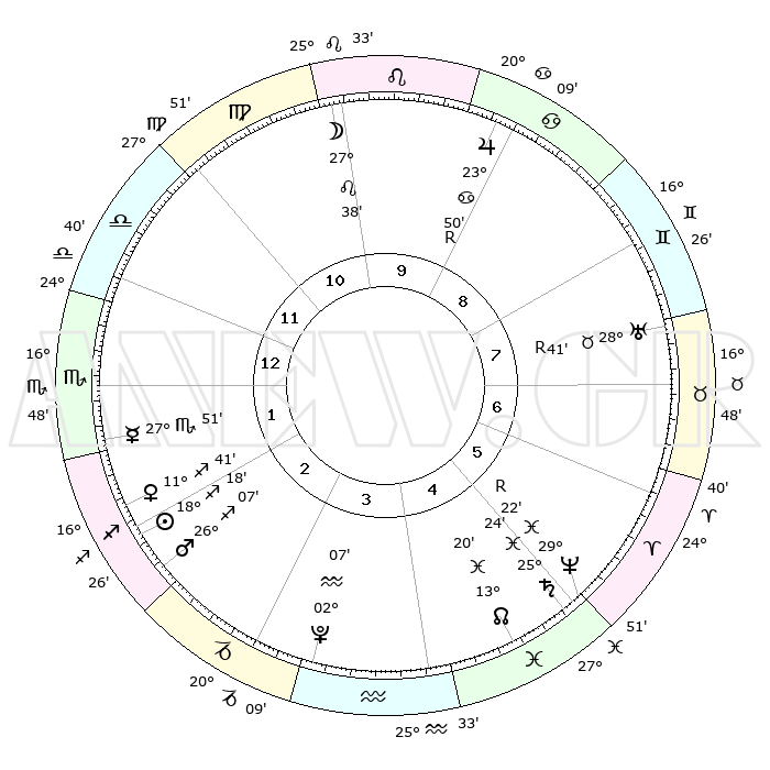 | | ΘΕΣΕΙΣ ΠΛΑΝΗΤΩΝ ΑΣΤΡΟΛΟΓΙΚΟΥ ΧΑΡΤΗ ΤΗΣ ΣΤΙΓΜΗΣ ΑΥΤΗΣ | | | | Πλανήτης | Ζώδιο | Μοίρες | Δεκαήμ. | Σε οίκο | Απόκλιση | | Ακμές των οίκων | | Ηλιος | Τοξότης | 18°16' | Δεύτερο | 2 | 22 S 55 | | 1ος | 09°22' | Σκορπιός | | Σελήνη | Λέων | 27°18' | Τρίτο | 10 | 13 N 42 | | 2ος | 08°23' | Τοξότης | | Ερμής | Σκορπιός | 27°49' | Τρίτο | 1 | 17 S 37 | | 3ος | 11°13' | Αιγόκερως | | Αφροδίτη | Τοξότης | 11°39' | Δεύτερο | 2 | 21 S 49 | | 4ος | 16°05' | Υδροχόος | | Αρης | Τοξότης | 26°05' | Τρίτο | 2 | 24 S 07 | | 5ος | 18°46' | Ιχθείς | | Δίας | Καρκίνος | 23°50'R | Τρίτο | 9 | 21 N 31 | | 6ος | 16°29' | Κριός | | Κρόνος | Ιχθείς | 25°24' | Τρίτο | 5 | 03 S 58 | | 7ος | 09°22' | Ταύρος | | Ουρανός | Ταύρος | 28°41'R | Τρίτο | 7 | 19 N 40 | | 8ος | 08°23' | Δίδυμοι | | Ποσειδώνας | Ιχθείς | 29°22'R | Τρίτο | 5 | 01 S 29 | | 9ος | 11°13' | Καρκίνος | | Πλούτωνας | Υδροχόος | 02°07' | Πρώτο | 3 | 23 S 21 | | 10ος | 16°05' | Λέων | | Β. Δεσμός | Ιχθείς | 13°20' | Δεύτερο | 4 | 06 S 33 | | 11ος | 18°46' | Παρθένος | | Ωροσκόπος | Σκορπιός | 09°22' | Πρώτο | | | 12ος | 16°29' | Ζυγός | | Μεσουράνημα | Λέων | 16°05' | Δεύτερο | | | |