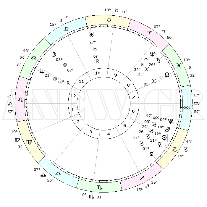 | | ΘΕΣΕΙΣ ΠΛΑΝΗΤΩΝ ΑΣΤΡΟΛΟΓΙΚΟΥ ΧΑΡΤΗ ΤΗΣ ΣΤΙΓΜΗΣ ΑΥΤΗΣ | | | | Πλανήτης | Ζώδιο | Μοίρες | Δεκαήμ. | Σε οίκο | Απόκλιση | | Ακμές των οίκων | | Ηλιος | Αιγόκερως | 12°18' | Δεύτερο | 6 | 22 S 52 | | 1ος | 28°47' | Καρκίνος | | Σελήνη | Καρκίνος | 02°08' | Πρώτο | 12 | 28 N 08 | | 2ος | 19°45' | Λέων | | Ερμής | Αιγόκερως | 01°15' | Πρώτο | 6 | 24 S 11 | | 3ος | 14°38' | Παρθένος | | Αφροδίτη | Αιγόκερως | 11°21' | Δεύτερο | 6 | 23 S 31 | | 4ος | 15°31' | Ζυγός | | Αρης | Αιγόκερως | 13°60' | Δεύτερο | 6 | 23 S 36 | | 5ος | 21°35' | Σκορπιός | | Δίας | Καρκίνος | 21°08'R | Τρίτο | 12 | 22 N 01 | | 6ος | 27°29' | Τοξότης | | Κρόνος | Ιχθείς | 26°23' | Τρίτο | 9 | 03 S 30 | | 7ος | 28°47' | Αιγόκερως | | Ουρανός | Ταύρος | 27°54'R | Τρίτο | 11 | 19 N 30 | | 8ος | 19°45' | Υδροχόος | | Ποσειδώνας | Ιχθείς | 29°32' | Τρίτο | 9 | 01 S 24 | | 9ος | 14°38' | Ιχθείς | | Πλούτωνας | Υδροχόος | 02°46' | Πρώτο | 7 | 23 S 12 | | 10ος | 15°31' | Κριός | | Β. Δεσμός | Ιχθείς | 12°05' | Δεύτερο | 8 | 07 S 02 | | 11ος | 21°35' | Ταύρος | | Ωροσκόπος | Καρκίνος | 28°47' | Τρίτο | | | 12ος | 27°29' | Δίδυμοι | | Μεσουράνημα | Κριός | 15°31' | Δεύτερο | | | |