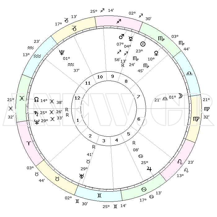 | | ΘΕΣΕΙΣ ΠΛΑΝΗΤΩΝ ΑΣΤΡΟΛΟΓΙΚΟΥ ΧΑΡΤΗ ΤΗΣ ΣΤΙΓΜΗΣ ΑΥΤΗΣ | | | | Πλανήτης | Ζώδιο | Μοίρες | Δεκαήμ. | Σε οίκο | Απόκλιση | | Ακμές των οίκων | | Ηλιος | Σκορπιός | 23°20' | Τρίτο | 9 | 18 S 36 | | 1ος | 15°20' | Υδροχόος | | Σελήνη | Ζυγός | 00°33' | Πρώτο | 7 | 01 S 23 | | 2ος | 01°02' | Κριός | | Ερμής | Τοξότης | 04°17'R | Πρώτο | 10 | 22 S 04 | | 3ος | 06°41' | Ταύρος | | Αφροδίτη | Σκορπιός | 10°41' | Δεύτερο | 9 | 13 S 53 | | 4ος | 02°48' | Δίδυμοι | | Αρης | Τοξότης | 07°53' | Πρώτο | 10 | 22 S 08 | | 5ος | 24°45' | Δίδυμοι | | Δίας | Καρκίνος | 25°08'R | Τρίτο | 6 | 21 N 13 | | 6ος | 17°01' | Καρκίνος | | Κρόνος | Ιχθείς | 25°26'R | Τρίτο | 1 | 04 S 02 | | 7ος | 15°20' | Λέων | | Ουρανός | Ταύρος | 29°42'R | Τρίτο | 3 | 19 N 53 | | 8ος | 01°02' | Ζυγός | | Ποσειδώνας | Ιχθείς | 29°33'R | Τρίτο | 1 | 01 S 26 | | 9ος | 06°41' | Σκορπιός | | Πλούτωνας | Υδροχόος | 01°37' | Πρώτο | 12 | 23 S 28 | | 10ος | 02°48' | Τοξότης | | Β. Δεσμός | Ιχθείς | 14°38' | Δεύτερο | 1 | 06 S 03 | | 11ος | 24°45' | Τοξότης | | Ωροσκόπος | Υδροχόος | 15°20' | Δεύτερο | | | 12ος | 17°01' | Αιγόκερως | | Μεσουράνημα | Τοξότης | 02°48' | Πρώτο | | | |