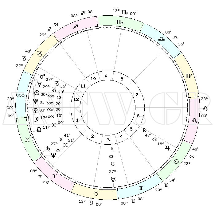 | | ΘΕΣΕΙΣ ΠΛΑΝΗΤΩΝ ΑΣΤΡΟΛΟΓΙΚΟΥ ΧΑΡΤΗ ΤΗΣ ΣΤΙΓΜΗΣ ΑΥΤΗΣ | | | | Πλανήτης | Ζώδιο | Μοίρες | Δεκαήμ. | Σε οίκο | Απόκλιση | | Ακμές των οίκων | | Ηλιος | Υδροχόος | 00°07' | Πρώτο | 1 | 20 S 07 | | 1ος | 11°47' | Αιγόκερως | | Σελήνη | Υδροχόος | 15°56' | Δεύτερο | 1 | 18 S 01 | | 2ος | 21°56' | Υδροχόος | | Ερμής | Αιγόκερως | 29°10' | Τρίτο | 1 | 22 S 17 | | 3ος | 02°11' | Κριός | | Αφροδίτη | Υδροχόος | 03°21' | Πρώτο | 1 | 20 S 30 | | 4ος | 04°02' | Ταύρος | | Αρης | Αιγόκερως | 27°31' | Τρίτο | 1 | 21 S 38 | | 5ος | 28°39' | Ταύρος | | Δίας | Καρκίνος | 18°48'R | Δεύτερο | 7 | 22 N 24 | | 6ος | 19°56' | Δίδυμοι | | Κρόνος | Ιχθείς | 27°40' | Τρίτο | 2 | 02 S 57 | | 7ος | 11°47' | Καρκίνος | | Ουρανός | Ταύρος | 27°33'R | Τρίτο | 4 | 19 N 25 | | 8ος | 21°56' | Λέων | | Ποσειδώνας | Ιχθείς | 29°51' | Τρίτο | 2 | 01 S 16 | | 9ος | 02°11' | Ζυγός | | Πλούτωνας | Υδροχόος | 03°19' | Πρώτο | 1 | 23 S 06 | | 10ος | 04°02' | Σκορπιός | | Β. Δεσμός | Ιχθείς | 11°09' | Δεύτερο | 2 | 07 S 23 | | 11ος | 28°39' | Σκορπιός | | Ωροσκόπος | Αιγόκερως | 11°47' | Δεύτερο | | | 12ος | 19°56' | Τοξότης | | Μεσουράνημα | Σκορπιός | 04°02' | Πρώτο | | | |
