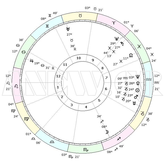 | | ΘΕΣΕΙΣ ΠΛΑΝΗΤΩΝ ΑΣΤΡΟΛΟΓΙΚΟΥ ΧΑΡΤΗ ΤΗΣ ΣΤΙΓΜΗΣ ΑΥΤΗΣ | | | | Πλανήτης | Ζώδιο | Μοίρες | Δεκαήμ. | Σε οίκο | Απόκλιση | | Ακμές των οίκων | | Ηλιος | Αιγόκερως | 24°28' | Τρίτο | 7 | 21 S 13 | | 1ος | 21°26' | Καρκίνος | | Σελήνη | Τοξότης | 07°43' | Πρώτο | 5 | 26 S 38 | | 2ος | 12°02' | Λέων | | Ερμής | Αιγόκερως | 20°03' | Τρίτο | 6 | 23 S 41 | | 3ος | 05°57' | Παρθένος | | Αφροδίτη | Αιγόκερως | 26°22' | Τρίτο | 7 | 21 S 49 | | 4ος | 05°47' | Ζυγός | | Αρης | Αιγόκερως | 23°12' | Τρίτο | 7 | 22 S 24 | | 5ος | 11°49' | Σκορπιός | | Δίας | Καρκίνος | 19°32'R | Δεύτερο | 12 | 22 N 17 | | 6ος | 18°58' | Τοξότης | | Κρόνος | Ιχθείς | 27°13' | Τρίτο | 9 | 03 S 09 | | 7ος | 21°26' | Αιγόκερως | | Ουρανός | Ταύρος | 27°38'R | Τρίτο | 11 | 19 N 26 | | 8ος | 12°01' | Υδροχόος | | Ποσειδώνας | Ιχθείς | 29°44' | Τρίτο | 9 | 01 S 19 | | 9ος | 05°57' | Ιχθείς | | Πλούτωνας | Υδροχόος | 03°09' | Πρώτο | 7 | 23 S 08 | | 10ος | 05°47' | Κριός | | Β. Δεσμός | Ιχθείς | 11°27' | Δεύτερο | 9 | 07 S 16 | | 11ος | 11°49' | Ταύρος | | Ωροσκόπος | Καρκίνος | 21°26' | Τρίτο | | | 12ος | 18°58' | Δίδυμοι | | Μεσουράνημα | Κριός | 05°47' | Πρώτο | | | |