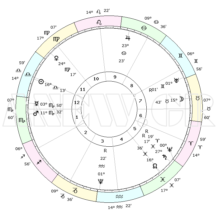 | ΘΕΣΕΙΣ ΠΛΑΝΗΤΩΝ ΑΣΤΡΟΛΟΓΙΚΟΥ ΧΑΡΤΗ ΤΗΣ ΣΤΙΓΜΗΣ ΑΥΤΗΣ | | Πλανήτης | Ζώδιο | Μοίρες | Δεκαήμ. | Σε οίκο | Απόκλιση | | Ακμές των οίκων | Ηλιος | Ζυγός | 16°08' | Δεύτερο | 1 | 06 S 20 | | 1ος | 10°37' | Ζυγός | Σελήνη | Ταύρος | 14°18' | Δεύτερο | 8 | 20 N 16 | | 2ος | 07°54' | Σκορπιός | Ερμής | Σκορπιός | 03°42' | Πρώτο | 1 | 13 S 46 | | 3ος | 08°45' | Τοξότης | Αφροδίτη | Παρθένος | 24°10' | Τρίτο | 12 | 03 N 39 | | 4ος | 11°57' | Αιγόκερως | Αρης | Σκορπιός | 11°28' | Δεύτερο | 2 | 15 S 26 | | 5ος | 14°53' | Υδροχόος | Δίας | Καρκίνος | 23°23' | Τρίτο | 10 | 21 N 27 | | 6ος | 14°52' | Ιχθείς | Κρόνος | Ιχθείς | 27°17'R | Τρίτο | 6 | 03 S 23 | | 7ος | 10°37' | Κριός | Ουρανός | Δίδυμοι | 01°01'R | Πρώτο | 8 | 20 N 09 | | 8ος | 07°54' | Ταύρος | Ποσειδώνας | Κριός | 00°20'R | Πρώτο | 6 | 01 S 08 | | 9ος | 08°45' | Δίδυμοι | Πλούτωνας | Υδροχόος | 01°22'R | Πρώτο | 4 | 23 S 32 | | 10ος | 11°57' | Καρκίνος | Β. Δεσμός | Ιχθείς | 16°36' | Δεύτερο | 6 | 05 S 17 | | 11ος | 14°53' | Λέων | Ωροσκόπος | Ζυγός | 10°37' | Δεύτερο | | | 12ος | 14°52' | Παρθένος | Μεσουράνημα | Καρκίνος | 11°57' | Δεύτερο | | | |