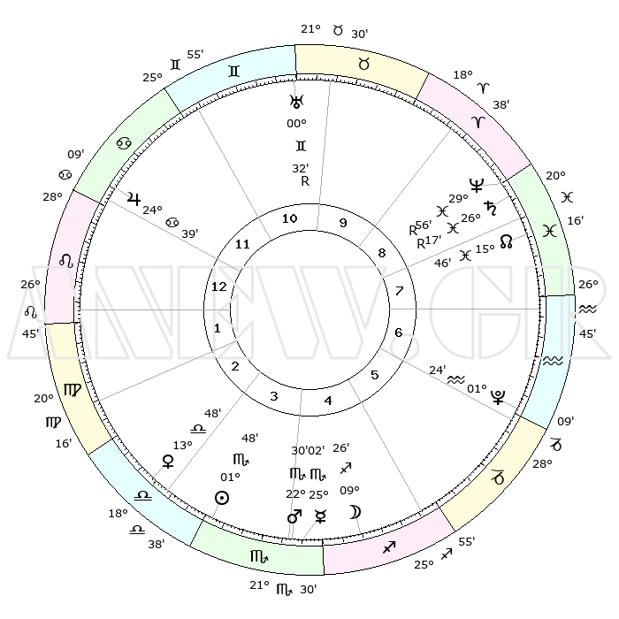 | | ΘΕΣΕΙΣ ΠΛΑΝΗΤΩΝ ΑΣΤΡΟΛΟΓΙΚΟΥ ΧΑΡΤΗ ΤΗΣ ΣΤΙΓΜΗΣ ΑΥΤΗΣ | | | | Πλανήτης | Ζώδιο | Μοίρες | Δεκαήμ. | Σε οίκο | Απόκλιση | | Ακμές των οίκων | | Ηλιος | Σκορπιός | 01°19' | Πρώτο | 9 | 11 S 56 | | 1ος | 01°11' | Υδροχόος | | Σελήνη | Τοξότης | 03°33' | Πρώτο | 10 | 25 S 45 | | 2ος | 15°29' | Ιχθείς | | Ερμής | Σκορπιός | 24°27' | Τρίτο | 10 | 21 S 23 | | 3ος | 23°44' | Κριός | | Αφροδίτη | Ζυγός | 13°11' | Δεύτερο | 8 | 03 S 48 | | 4ος | 22°00' | Ταύρος | | Αρης | Σκορπιός | 22°09' | Τρίτο | 10 | 18 S 37 | | 5ος | 14°41' | Δίδυμοι | | Δίας | Καρκίνος | 24°37' | Τρίτο | 6 | 21 N 16 | | 6ος | 06°08' | Καρκίνος | | Κρόνος | Ιχθείς | 26°18'R | Τρίτο | 2 | 03 S 45 | | 7ος | 01°11' | Λέων | | Ουρανός | Δίδυμοι | 00°33'R | Πρώτο | 4 | 20 N 03 | | 8ος | 15°29' | Παρθένος | | Ποσειδώνας | Ιχθείς | 29°57'R | Τρίτο | 2 | 01 S 17 | | 9ος | 23°44' | Ζυγός | | Πλούτωνας | Υδροχόος | 01°24' | Πρώτο | 1 | 23 S 32 | | 10ος | 22°00' | Σκορπιός | | Β. Δεσμός | Ιχθείς | 15°48' | Δεύτερο | 2 | 05 S 36 | | 11ος | 14°41' | Τοξότης | | Ωροσκόπος | Υδροχόος | 01°11' | Πρώτο | | | 12ος | 06°08' | Αιγόκερως | | Μεσουράνημα | Σκορπιός | 22°00' | Τρίτο | | | |