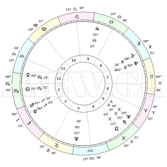 | | ΘΕΣΕΙΣ ΠΛΑΝΗΤΩΝ ΑΣΤΡΟΛΟΓΙΚΟΥ ΧΑΡΤΗ ΤΗΣ ΣΤΙΓΜΗΣ ΑΥΤΗΣ | | | | Πλανήτης | Ζώδιο | Μοίρες | Δεκαήμ. | Σε οίκο | Απόκλιση | | Ακμές των οίκων | | Ηλιος | Σκορπιός | 14°51' | Δεύτερο | 2 | 16 S 17 | | 1ος | 21°10' | Παρθένος | | Σελήνη | Δίδυμοι | 05°51' | Πρώτο | 9 | 26 N 11 | | 2ος | 17°04' | Ζυγός | | Ερμής | Τοξότης | 06°20' | Πρώτο | 3 | 24 S 00 | | 3ος | 17°08' | Σκορπιός | | Αφροδίτη | Σκορπιός | 00°07' | Πρώτο | 2 | 10 S 13 | | 4ος | 20°04' | Τοξότης | | Αρης | Τοξότης | 01°47' | Πρώτο | 3 | 20 S 57 | | 5ος | 23°13' | Αιγόκερως | | Δίας | Καρκίνος | 25°07' | Τρίτο | 11 | 21 N 12 | | 6ος | 23°59' | Υδροχόος | | Κρόνος | Ιχθείς | 25°41'R | Τρίτο | 7 | 03 S 58 | | 7ος | 21°10' | Ιχθείς | | Ουρανός | Δίδυμοι | 00°02'R | Πρώτο | 9 | 19 N 57 | | 8ος | 17°04' | Κριός | | Ποσειδώνας | Ιχθείς | 29°41'R | Τρίτο | 7 | 01 S 23 | | 9ος | 17°08' | Ταύρος | | Πλούτωνας | Υδροχόος | 01°30' | Πρώτο | 5 | 23 S 30 | | 10ος | 20°04' | Δίδυμοι | | Β. Δεσμός | Ιχθείς | 15°05' | Δεύτερο | 6 | 05 S 53 | | 11ος | 23°13' | Καρκίνος | | Ωροσκόπος | Παρθένος | 21°10' | Τρίτο | | | 12ος | 23°59' | Λέων | | Μεσουράνημα | Δίδυμοι | 20°04' | Τρίτο | | | |
