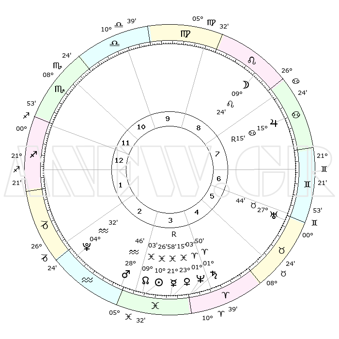 | | ΘΕΣΕΙΣ ΠΛΑΝΗΤΩΝ ΑΣΤΡΟΛΟΓΙΚΟΥ ΧΑΡΤΗ ΤΗΣ ΣΤΙΓΜΗΣ ΑΥΤΗΣ | | | | Πλανήτης | Ζώδιο | Μοίρες | Δεκαήμ. | Σε οίκο | Απόκλιση | | Ακμές των οίκων | | Ηλιος | Ιχθείς | 10°22' | Δεύτερο | 3 | 07 S 41 | | 1ος | 03°28' | Τοξότης | | Σελήνη | Λέων | 08°35' | Πρώτο | 8 | 20 N 42 | | 2ος | 05°06' | Αιγόκερως | | Ερμής | Ιχθείς | 21°60'R | Τρίτο | 4 | 00 S 09 | | 3ος | 11°23' | Υδροχόος | | Αφροδίτη | Ιχθείς | 23°11' | Τρίτο | 4 | 03 S 57 | | 4ος | 17°29' | Ιχθείς | | Αρης | Υδροχόος | 28°43' | Τρίτο | 3 | 12 S 56 | | 5ος | 18°04' | Κριός | | Δίας | Καρκίνος | 15°15'R | Δεύτερο | 8 | 22 N 54 | | 6ος | 12°39' | Ταύρος | | Κρόνος | Κριός | 01°50' | Πρώτο | 4 | 01 S 14 | | 7ος | 03°28' | Δίδυμοι | | Ουρανός | Ταύρος | 27°44' | Τρίτο | 6 | 19 N 28 | | 8ος | 05°06' | Καρκίνος | | Ποσειδώνας | Κριός | 01°03' | Πρώτο | 4 | 00 S 47 | | 9ος | 11°23' | Λέων | | Πλούτωνας | Υδροχόος | 04°32' | Πρώτο | 2 | 22 S 53 | | 10ος | 17°29' | Παρθένος | | Β. Δεσμός | Ιχθείς | 09°03' | Πρώτο | 3 | 08 S 11 | | 11ος | 18°04' | Ζυγός | | Ωροσκόπος | Τοξότης | 03°28' | Πρώτο | | | 12ος | 12°39' | Σκορπιός | | Μεσουράνημα | Παρθένος | 17°29' | Δεύτερο | | | |