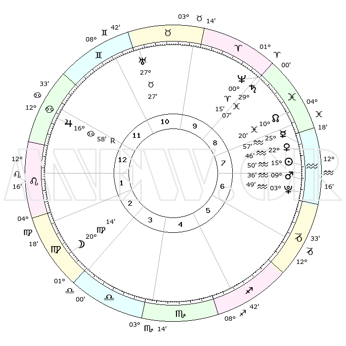 | | ΘΕΣΕΙΣ ΠΛΑΝΗΤΩΝ ΑΣΤΡΟΛΟΓΙΚΟΥ ΧΑΡΤΗ ΤΗΣ ΣΤΙΓΜΗΣ ΑΥΤΗΣ | | | | Πλανήτης | Ζώδιο | Μοίρες | Δεκαήμ. | Σε οίκο | Απόκλιση | | Ακμές των οίκων | | Ηλιος | Υδροχόος | 15°45' | Δεύτερο | 8 | 16 S 07 | | 1ος | 21°08' | Καρκίνος | | Σελήνη | Παρθένος | 19°17' | Δεύτερο | 3 | 03 N 23 | | 2ος | 11°43' | Λέων | | Ερμής | Υδροχόος | 25°49' | Τρίτο | 8 | 14 S 25 | | 3ος | 05°36' | Παρθένος | | Αφροδίτη | Υδροχόος | 22°40' | Τρίτο | 8 | 15 S 17 | | 4ος | 05°24' | Ζυγός | | Αρης | Υδροχόος | 09°32' | Πρώτο | 7 | 18 S 53 | | 5ος | 11°25' | Σκορπιός | | Δίας | Καρκίνος | 16°58'R | Δεύτερο | 12 | 22 N 40 | | 6ος | 18°37' | Τοξότης | | Κρόνος | Ιχθείς | 29°07' | Τρίτο | 9 | 02 S 20 | | 7ος | 21°08' | Αιγόκερως | | Ουρανός | Ταύρος | 27°27' | Τρίτο | 11 | 19 N 24 | | 8ος | 11°43' | Υδροχόος | | Ποσειδώνας | Κριός | 00°15' | Πρώτο | 9 | 01 S 06 | | 9ος | 05°36' | Ιχθείς | | Πλούτωνας | Υδροχόος | 03°49' | Πρώτο | 7 | 23 S 00 | | 10ος | 05°24' | Κριός | | Β. Δεσμός | Ιχθείς | 10°20' | Δεύτερο | 9 | 07 S 41 | | 11ος | 11°25' | Ταύρος | | Ωροσκόπος | Καρκίνος | 21°08' | Τρίτο | | | 12ος | 18°37' | Δίδυμοι | | Μεσουράνημα | Κριός | 05°24' | Πρώτο | | | |
