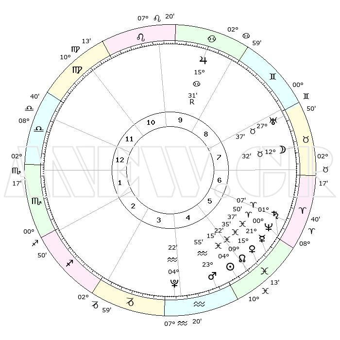 | | ΘΕΣΕΙΣ ΠΛΑΝΗΤΩΝ ΑΣΤΡΟΛΟΓΙΚΟΥ ΧΑΡΤΗ ΤΗΣ ΣΤΙΓΜΗΣ ΑΥΤΗΣ | | | | Πλανήτης | Ζώδιο | Μοίρες | Δεκαήμ. | Σε οίκο | Απόκλιση | | Ακμές των οίκων | | Ηλιος | Ιχθείς | 04°10' | Πρώτο | 5 | 09 S 59 | | 1ος | 08°54' | Ζυγός | | Σελήνη | Ταύρος | 11°24' | Δεύτερο | 8 | 19 N 42 | | 2ος | 06°06' | Σκορπιός | | Ερμής | Ιχθείς | 21°34' | Τρίτο | 6 | 01 S 32 | | 3ος | 06°52' | Τοξότης | | Αφροδίτη | Ιχθείς | 15°29' | Δεύτερο | 6 | 07 S 03 | | 4ος | 10°01' | Αιγόκερως | | Αρης | Υδροχόος | 23°52' | Τρίτο | 5 | 14 S 36 | | 5ος | 12°57' | Υδροχόος | | Δίας | Καρκίνος | 15°31'R | Δεύτερο | 10 | 22 N 52 | | 6ος | 13°01' | Ιχθείς | | Κρόνος | Κριός | 01°06' | Πρώτο | 6 | 01 S 31 | | 7ος | 08°54' | Κριός | | Ουρανός | Ταύρος | 27°37' | Τρίτο | 8 | 19 N 27 | | 8ος | 06°06' | Ταύρος | | Ποσειδώνας | Κριός | 00°50' | Πρώτο | 6 | 00 S 52 | | 9ος | 06°52' | Δίδυμοι | | Πλούτωνας | Υδροχόος | 04°22' | Πρώτο | 4 | 22 S 54 | | 10ος | 10°01' | Καρκίνος | | Β. Δεσμός | Ιχθείς | 09°22' | Πρώτο | 5 | 08 S 03 | | 11ος | 12°57' | Λέων | | Ωροσκόπος | Ζυγός | 08°54' | Πρώτο | | | 12ος | 13°01' | Παρθένος | | Μεσουράνημα | Καρκίνος | 10°01' | Δεύτερο | | | |