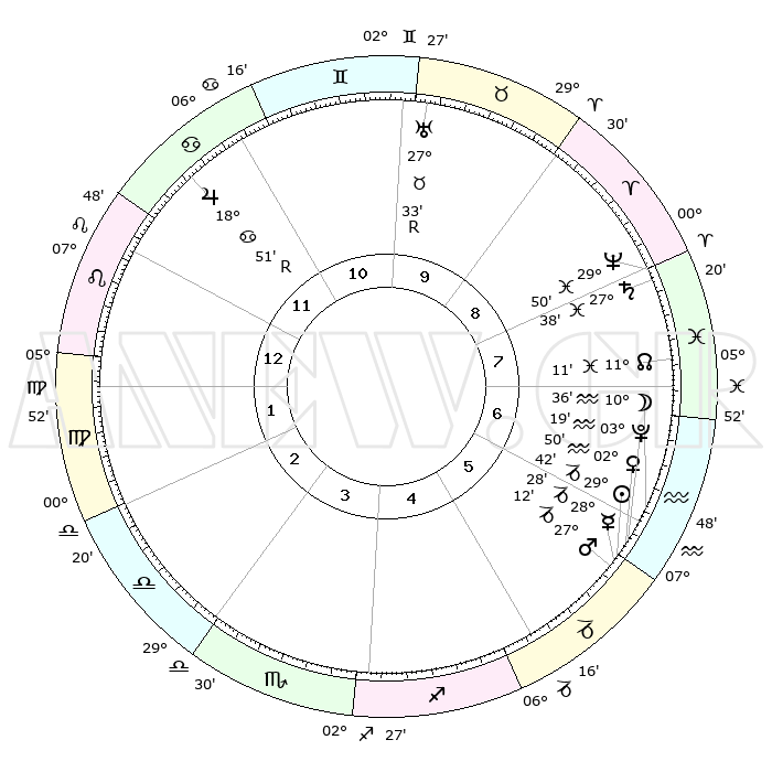 | | ΘΕΣΕΙΣ ΠΛΑΝΗΤΩΝ ΑΣΤΡΟΛΟΓΙΚΟΥ ΧΑΡΤΗ ΤΗΣ ΣΤΙΓΜΗΣ ΑΥΤΗΣ | | | | Πλανήτης | Ζώδιο | Μοίρες | Δεκαήμ. | Σε οίκο | Απόκλιση | | Ακμές των οίκων | | Ηλιος | Αιγόκερως | 29°38' | Τρίτο | 6 | 20 S 13 | | 1ος | 17°06' | Λέων | | Σελήνη | Υδροχόος | 09°47' | Πρώτο | 6 | 20 S 15 | | 2ος | 09°37' | Παρθένος | | Ερμής | Αιγόκερως | 28°22' | Τρίτο | 6 | 22 S 27 | | 3ος | 06°55' | Ζυγός | | Αφροδίτη | Υδροχόος | 02°45' | Πρώτο | 6 | 20 S 37 | | 4ος | 09°27' | Σκορπιός | | Αρης | Αιγόκερως | 27°09' | Τρίτο | 6 | 21 S 42 | | 5ος | 14°35' | Τοξότης | | Δίας | Καρκίνος | 18°51'R | Δεύτερο | 12 | 22 N 23 | | 6ος | 17°48' | Αιγόκερως | | Κρόνος | Ιχθείς | 27°38' | Τρίτο | 8 | 02 S 58 | | 7ος | 17°06' | Υδροχόος | | Ουρανός | Ταύρος | 27°34'R | Τρίτο | 10 | 19 N 25 | | 8ος | 09°37' | Ιχθείς | | Ποσειδώνας | Ιχθείς | 29°50' | Τρίτο | 8 | 01 S 17 | | 9ος | 06°55' | Κριός | | Πλούτωνας | Υδροχόος | 03°18' | Πρώτο | 6 | 23 S 06 | | 10ος | 09°27' | Ταύρος | | Β. Δεσμός | Ιχθείς | 11°11' | Δεύτερο | 8 | 07 S 22 | | 11ος | 14°35' | Δίδυμοι | | Ωροσκόπος | Λέων | 17°06' | Δεύτερο | | | 12ος | 17°48' | Καρκίνος | | Μεσουράνημα | Ταύρος | 09°27' | Πρώτο | | | |