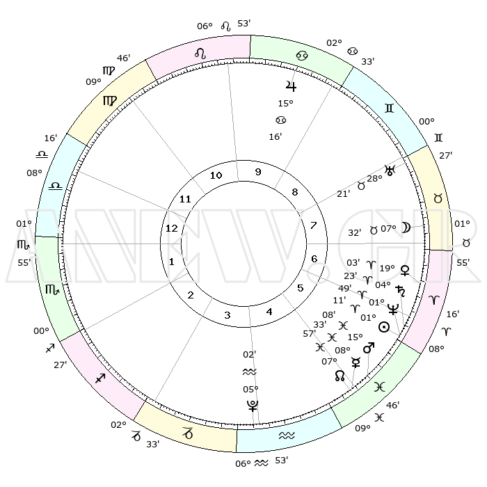 | | ΘΕΣΕΙΣ ΠΛΑΝΗΤΩΝ ΑΣΤΡΟΛΟΓΙΚΟΥ ΧΑΡΤΗ ΤΗΣ ΣΤΙΓΜΗΣ ΑΥΤΗΣ | | | | Πλανήτης | Ζώδιο | Μοίρες | Δεκαήμ. | Σε οίκο | Απόκλιση | | Ακμές των οίκων | | Ηλιος | Κριός | 01°06' | Πρώτο | 6 | 00 N 26 | | 1ος | 10°59' | Ζυγός | | Σελήνη | Ταύρος | 06°30' | Πρώτο | 7 | 17 N 51 | | 2ος | 08°18' | Σκορπιός | | Ερμής | Ιχθείς | 08°32' | Πρώτο | 5 | 07 S 39 | | 3ος | 09°10' | Τοξότης | | Αφροδίτη | Κριός | 18°58' | Δεύτερο | 7 | 06 N 39 | | 4ος | 12°23' | Αιγόκερως | | Αρης | Ιχθείς | 15°04' | Δεύτερο | 5 | 06 S 52 | | 5ος | 15°18' | Υδροχόος | | Δίας | Καρκίνος | 15°16' | Δεύτερο | 10 | 22 N 55 | | 6ος | 15°16' | Ιχθείς | | Κρόνος | Κριός | 04°23' | Πρώτο | 6 | 00 S 13 | | 7ος | 10°59' | Κριός | | Ουρανός | Ταύρος | 28°21' | Τρίτο | 8 | 19 N 37 | | 8ος | 08°18' | Ταύρος | | Ποσειδώνας | Κριός | 01°49' | Πρώτο | 6 | 00 S 29 | | 9ος | 09°10' | Δίδυμοι | | Πλούτωνας | Υδροχόος | 05°02' | Πρώτο | 4 | 22 S 48 | | 10ος | 12°23' | Καρκίνος | | Β. Δεσμός | Ιχθείς | 07°57' | Πρώτο | 5 | 08 S 35 | | 11ος | 15°18' | Λέων | | Ωροσκόπος | Ζυγός | 10°59' | Δεύτερο | | | 12ος | 15°16' | Παρθένος | | Μεσουράνημα | Καρκίνος | 12°23' | Δεύτερο | | | |