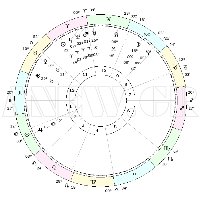 | | ΘΕΣΕΙΣ ΠΛΑΝΗΤΩΝ ΑΣΤΡΟΛΟΓΙΚΟΥ ΧΑΡΤΗ ΤΗΣ ΣΤΙΓΜΗΣ ΑΥΤΗΣ | | | | Πλανήτης | Ζώδιο | Μοίρες | Δεκαήμ. | Σε οίκο | Απόκλιση | | Ακμές των οίκων | | Ηλιος | Κριός | 22°20' | Τρίτο | 12 | 08 N 42 | | 1ος | 24°51' | Ταύρος | | Σελήνη | Υδροχόος | 15°19' | Δεύτερο | 10 | 18 S 09 | | 2ος | 20°45' | Δίδυμοι | | Ερμής | Ιχθείς | 26°03' | Τρίτο | 11 | 03 S 51 | | 3ος | 12°23' | Καρκίνος | | Αφροδίτη | Ταύρος | 15°26' | Δεύτερο | 12 | 16 N 30 | | 4ος | 04°48' | Λέων | | Αρης | Κριός | 01°53' | Πρώτο | 11 | 00 S 10 | | 5ος | 02°25' | Παρθένος | | Δίας | Καρκίνος | 16°41' | Δεύτερο | 3 | 22 N 46 | | 6ος | 09°60' | Ζυγός | | Κρόνος | Κριός | 07°03' | Πρώτο | 11 | 00 N 50 | | 7ος | 24°51' | Σκορπιός | | Ουρανός | Ταύρος | 29°17' | Τρίτο | 1 | 19 N 50 | | 8ος | 20°45' | Τοξότης | | Ποσειδώνας | Κριός | 02°37' | Πρώτο | 11 | 00 S 10 | | 9ος | 12°23' | Αιγόκερως | | Πλούτωνας | Υδροχόος | 05°22' | Πρώτο | 10 | 22 S 47 | | 10ος | 04°48' | Υδροχόος | | Β. Δεσμός | Ιχθείς | 06°49' | Πρώτο | 11 | 09 S 01 | | 11ος | 02°25' | Ιχθείς | | Ωροσκόπος | Ταύρος | 24°51' | Τρίτο | | | 12ος | 09°60' | Κριός | | Μεσουράνημα | Υδροχόος | 04°48' | Πρώτο | | | |