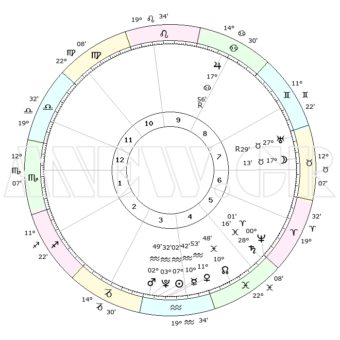 | | ΘΕΣΕΙΣ ΠΛΑΝΗΤΩΝ ΑΣΤΡΟΛΟΓΙΚΟΥ ΧΑΡΤΗ ΤΗΣ ΣΤΙΓΜΗΣ ΑΥΤΗΣ | | | | Πλανήτης | Ζώδιο | Μοίρες | Δεκαήμ. | Σε οίκο | Απόκλιση | | Ακμές των οίκων | | Ηλιος | Υδροχόος | 06°58' | Πρώτο | 4 | 18 S 32 | | 1ος | 23°21' | Ζυγός | | Σελήνη | Ταύρος | 16°18' | Δεύτερο | 7 | 21 N 17 | | 2ος | 21°23' | Σκορπιός | | Ερμής | Υδροχόος | 10°35' | Δεύτερο | 4 | 19 S 34 | | 3ος | 22°52' | Τοξότης | | Αφροδίτη | Υδροχόος | 11°48' | Δεύτερο | 4 | 18 S 28 | | 4ος | 26°38' | Αιγόκερως | | Αρης | Υδροχόος | 02°46' | Πρώτο | 4 | 20 S 32 | | 5ος | 29°35' | Υδροχόος | | Δίας | Καρκίνος | 17°57'R | Δεύτερο | 9 | 22 N 31 | | 6ος | 28°48' | Ιχθείς | | Κρόνος | Ιχθείς | 28°16' | Τρίτο | 5 | 02 S 42 | | 7ος | 23°21' | Κριός | | Ουρανός | Ταύρος | 27°29'R | Τρίτο | 8 | 19 N 24 | | 8ος | 21°23' | Ταύρος | | Ποσειδώνας | Κριός | 00°00' | Πρώτο | 6 | 01 S 12 | | 9ος | 22°52' | Δίδυμοι | | Πλούτωνας | Υδροχόος | 03°32' | Πρώτο | 4 | 23 S 03 | | 10ος | 26°38' | Καρκίνος | | Β. Δεσμός | Ιχθείς | 10°48' | Δεύτερο | 5 | 07 S 31 | | 11ος | 29°35' | Λέων | | Ωροσκόπος | Ζυγός | 23°21' | Τρίτο | | | 12ος | 28°48' | Παρθένος | | Μεσουράνημα | Καρκίνος | 26°38' | Τρίτο | | | |