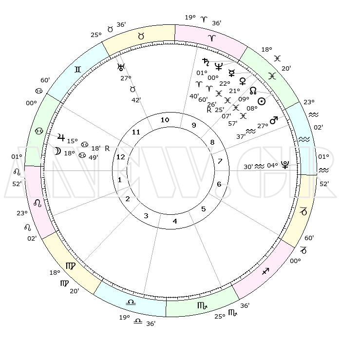 | | ΘΕΣΕΙΣ ΠΛΑΝΗΤΩΝ ΑΣΤΡΟΛΟΓΙΚΟΥ ΧΑΡΤΗ ΤΗΣ ΣΤΙΓΜΗΣ ΑΥΤΗΣ | | | | Πλανήτης | Ζώδιο | Μοίρες | Δεκαήμ. | Σε οίκο | Απόκλιση | | Ακμές των οίκων | | Ηλιος | Ιχθείς | 08°54' | Πρώτο | 9 | 08 S 14 | | 1ος | 16°00' | Καρκίνος | | Σελήνη | Καρκίνος | 18°03' | Δεύτερο | 1 | 26 N 17 | | 2ος | 06°27' | Λέων | | Ερμής | Ιχθείς | 22°27'R | Τρίτο | 9 | 00 S 12 | | 3ος | 29°43' | Λέων | | Αφροδίτη | Ιχθείς | 21°21' | Τρίτο | 9 | 04 S 42 | | 4ος | 28°41' | Παρθένος | | Αρης | Υδροχόος | 27°34' | Τρίτο | 8 | 13 S 21 | | 5ος | 04°28' | Σκορπιός | | Δίας | Καρκίνος | 15°18'R | Δεύτερο | 12 | 22 N 54 | | 6ος | 12°31' | Τοξότης | | Κρόνος | Κριός | 01°40' | Πρώτο | 10 | 01 S 18 | | 7ος | 16°00' | Αιγόκερως | | Ουρανός | Ταύρος | 27°42' | Τρίτο | 11 | 19 N 28 | | 8ος | 06°27' | Υδροχόος | | Ποσειδώνας | Κριός | 00°60' | Πρώτο | 10 | 00 S 48 | | 9ος | 29°43' | Υδροχόος | | Πλούτωνας | Υδροχόος | 04°30' | Πρώτο | 7 | 22 S 53 | | 10ος | 28°41' | Ιχθείς | | Β. Δεσμός | Ιχθείς | 09°08' | Πρώτο | 9 | 08 S 09 | | 11ος | 04°28' | Ταύρος | | Ωροσκόπος | Καρκίνος | 16°00' | Δεύτερο | | | 12ος | 12°31' | Δίδυμοι | | Μεσουράνημα | Ιχθείς | 28°41' | Τρίτο | | | |