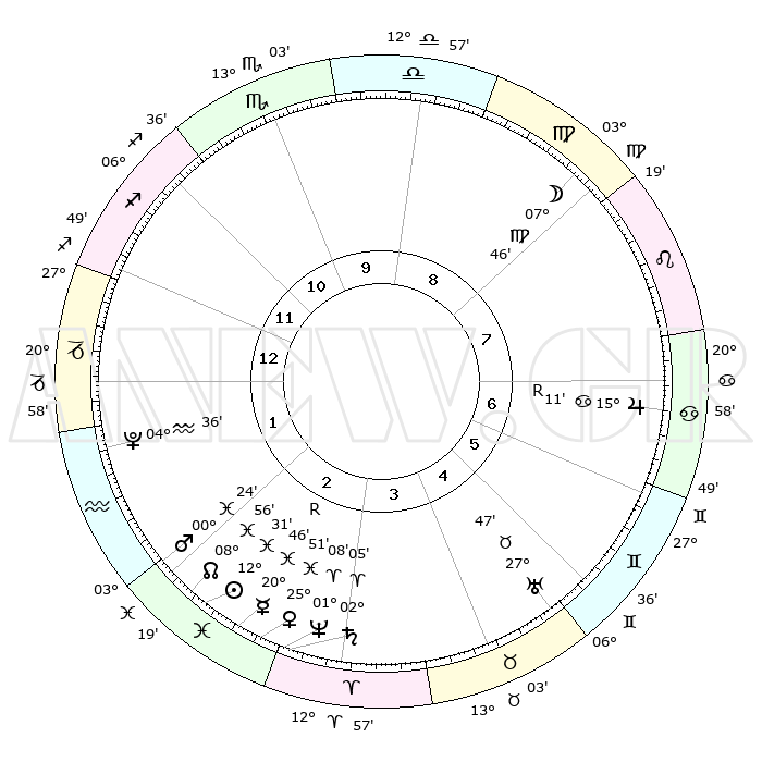 | | ΘΕΣΕΙΣ ΠΛΑΝΗΤΩΝ ΑΣΤΡΟΛΟΓΙΚΟΥ ΧΑΡΤΗ ΤΗΣ ΣΤΙΓΜΗΣ ΑΥΤΗΣ | | | | Πλανήτης | Ζώδιο | Μοίρες | Δεκαήμ. | Σε οίκο | Απόκλιση | | Ακμές των οίκων | | Ηλιος | Ιχθείς | 12°28' | Δεύτερο | 2 | 06 S 53 | | 1ος | 00°17' | Αιγόκερως | | Σελήνη | Παρθένος | 06°60' | Πρώτο | 8 | 09 N 07 | | 2ος | 07°30' | Υδροχόος | | Ερμής | Ιχθείς | 20°49'R | Τρίτο | 3 | 00 S 22 | | 3ος | 17°31' | Ιχθείς | | Αφροδίτη | Ιχθείς | 25°46' | Τρίτο | 3 | 02 S 54 | | 4ος | 21°25' | Κριός | | Αρης | Ιχθείς | 00°22' | Πρώτο | 2 | 12 S 22 | | 5ος | 17°41' | Ταύρος | | Δίας | Καρκίνος | 15°12'R | Δεύτερο | 7 | 22 N 55 | | 6ος | 09°28' | Δίδυμοι | | Κρόνος | Κριός | 02°05' | Πρώτο | 3 | 01 S 08 | | 7ος | 00°17' | Καρκίνος | | Ουρανός | Ταύρος | 27°47' | Τρίτο | 5 | 19 N 29 | | 8ος | 07°30' | Λέων | | Ποσειδώνας | Κριός | 01°07' | Πρώτο | 3 | 00 S 45 | | 9ος | 17°31' | Παρθένος | | Πλούτωνας | Υδροχόος | 04°35' | Πρώτο | 1 | 22 S 52 | | 10ος | 21°25' | Ζυγός | | Β. Δεσμός | Ιχθείς | 08°56' | Πρώτο | 2 | 08 S 13 | | 11ος | 17°41' | Σκορπιός | | Ωροσκόπος | Αιγόκερως | 00°17' | Πρώτο | | | 12ος | 09°28' | Τοξότης | | Μεσουράνημα | Ζυγός | 21°25' | Τρίτο | | | |