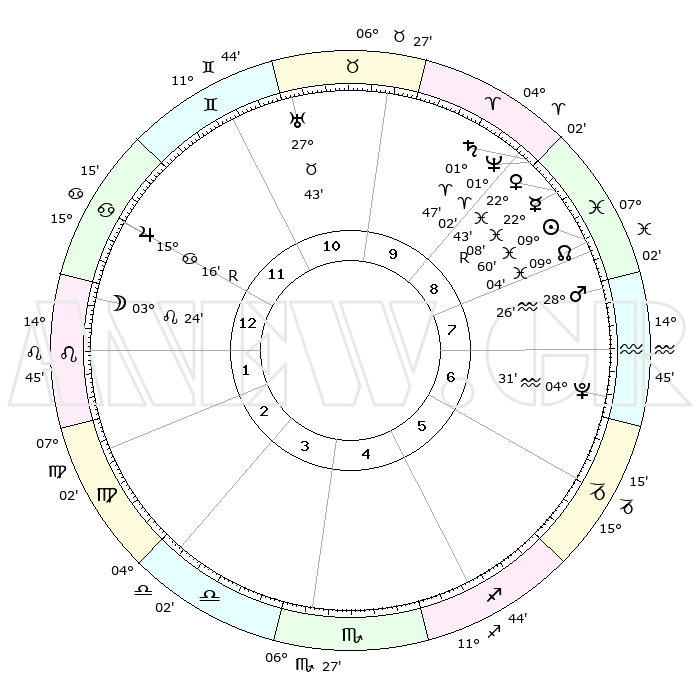 | | ΘΕΣΕΙΣ ΠΛΑΝΗΤΩΝ ΑΣΤΡΟΛΟΓΙΚΟΥ ΧΑΡΤΗ ΤΗΣ ΣΤΙΓΜΗΣ ΑΥΤΗΣ | | | | Πλανήτης | Ζώδιο | Μοίρες | Δεκαήμ. | Σε οίκο | Απόκλιση | | Ακμές των οίκων | | Ηλιος | Ιχθείς | 09°56' | Πρώτο | 8 | 07 S 50 | | 1ος | 26°34' | Καρκίνος | | Σελήνη | Λέων | 02°32' | Πρώτο | 1 | 22 N 39 | | 2ος | 17°24' | Λέων | | Ερμής | Ιχθείς | 22°10'R | Τρίτο | 9 | 00 S 09 | | 3ος | 11°59' | Παρθένος | | Αφροδίτη | Ιχθείς | 22°38' | Τρίτο | 9 | 04 S 11 | | 4ος | 12°34' | Ζυγός | | Αρης | Υδροχόος | 28°23' | Τρίτο | 8 | 13 S 04 | | 5ος | 18°40' | Σκορπιός | | Δίας | Καρκίνος | 15°16'R | Δεύτερο | 12 | 22 N 54 | | 6ος | 24°56' | Τοξότης | | Κρόνος | Κριός | 01°47' | Πρώτο | 9 | 01 S 15 | | 7ος | 26°34' | Αιγόκερως | | Ουρανός | Ταύρος | 27°43' | Τρίτο | 11 | 19 N 28 | | 8ος | 17°24' | Υδροχόος | | Ποσειδώνας | Κριός | 01°02' | Πρώτο | 9 | 00 S 47 | | 9ος | 11°59' | Ιχθείς | | Πλούτωνας | Υδροχόος | 04°31' | Πρώτο | 7 | 22 S 53 | | 10ος | 12°34' | Κριός | | Β. Δεσμός | Ιχθείς | 09°04' | Πρώτο | 8 | 08 S 10 | | 11ος | 18°40' | Ταύρος | | Ωροσκόπος | Καρκίνος | 26°34' | Τρίτο | | | 12ος | 24°56' | Δίδυμοι | | Μεσουράνημα | Κριός | 12°34' | Δεύτερο | | | |