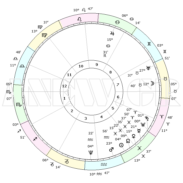 | | ΘΕΣΕΙΣ ΠΛΑΝΗΤΩΝ ΑΣΤΡΟΛΟΓΙΚΟΥ ΧΑΡΤΗ ΤΗΣ ΣΤΙΓΜΗΣ ΑΥΤΗΣ | | | | Πλανήτης | Ζώδιο | Μοίρες | Δεκαήμ. | Σε οίκο | Απόκλιση | | Ακμές των οίκων | | Ηλιος | Ιχθείς | 04°11' | Πρώτο | 5 | 09 S 58 | | 1ος | 12°60' | Ζυγός | | Σελήνη | Ταύρος | 11°36' | Δεύτερο | 8 | 19 N 46 | | 2ος | 10°26' | Σκορπιός | | Ερμής | Ιχθείς | 21°35' | Τρίτο | 6 | 01 S 32 | | 3ος | 11°23' | Τοξότης | | Αφροδίτη | Ιχθείς | 15°30' | Δεύτερο | 5 | 07 S 02 | | 4ος | 14°40' | Αιγόκερως | | Αρης | Υδροχόος | 23°52' | Τρίτο | 5 | 14 S 35 | | 5ος | 17°36' | Υδροχόος | | Δίας | Καρκίνος | 15°31'R | Δεύτερο | 10 | 22 N 52 | | 6ος | 17°28' | Ιχθείς | | Κρόνος | Κριός | 01°07' | Πρώτο | 6 | 01 S 31 | | 7ος | 12°60' | Κριός | | Ουρανός | Ταύρος | 27°37' | Τρίτο | 8 | 19 N 27 | | 8ος | 10°26' | Ταύρος | | Ποσειδώνας | Κριός | 00°50' | Πρώτο | 6 | 00 S 52 | | 9ος | 11°23' | Δίδυμοι | | Πλούτωνας | Υδροχόος | 04°22' | Πρώτο | 4 | 22 S 54 | | 10ος | 14°40' | Καρκίνος | | Β. Δεσμός | Ιχθείς | 09°22' | Πρώτο | 5 | 08 S 03 | | 11ος | 17°36' | Λέων | | Ωροσκόπος | Ζυγός | 12°60' | Δεύτερο | | | 12ος | 17°28' | Παρθένος | | Μεσουράνημα | Καρκίνος | 14°40' | Δεύτερο | | | |