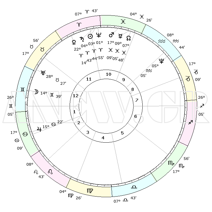 | | ΘΕΣΕΙΣ ΠΛΑΝΗΤΩΝ ΑΣΤΡΟΛΟΓΙΚΟΥ ΧΑΡΤΗ ΤΗΣ ΣΤΙΓΜΗΣ ΑΥΤΗΣ | | | | Πλανήτης | Ζώδιο | Μοίρες | Δεκαήμ. | Σε οίκο | Απόκλιση | | Ακμές των οίκων | | Ηλιος | Κριός | 03°39' | Πρώτο | 11 | 01 N 27 | | 1ος | 28°17' | Ταύρος | | Σελήνη | Δίδυμοι | 13°36' | Δεύτερο | 1 | 27 N 36 | | 2ος | 23°27' | Δίδυμοι | | Ερμής | Ιχθείς | 09°04' | Πρώτο | 11 | 08 S 01 | | 3ος | 14°56' | Καρκίνος | | Αφροδίτη | Κριός | 22°09' | Τρίτο | 12 | 07 N 56 | | 4ος | 07°34' | Λέων | | Αρης | Ιχθείς | 17°05' | Δεύτερο | 11 | 06 S 05 | | 5ος | 05°45' | Παρθένος | | Δίας | Καρκίνος | 15°22' | Δεύτερο | 3 | 22 N 55 | | 6ος | 13°55' | Ζυγός | | Κρόνος | Κριός | 04°42' | Πρώτο | 11 | 00 S 05 | | 7ος | 28°17' | Σκορπιός | | Ουρανός | Ταύρος | 28°27' | Τρίτο | 1 | 19 N 38 | | 8ος | 23°27' | Τοξότης | | Ποσειδώνας | Κριός | 01°55' | Πρώτο | 11 | 00 S 26 | | 9ος | 14°56' | Αιγόκερως | | Πλούτωνας | Υδροχόος | 05°05' | Πρώτο | 9 | 22 S 48 | | 10ος | 07°34' | Υδροχόος | | Β. Δεσμός | Ιχθείς | 07°49' | Πρώτο | 11 | 08 S 38 | | 11ος | 05°45' | Ιχθείς | | Ωροσκόπος | Ταύρος | 28°17' | Τρίτο | | | 12ος | 13°55' | Κριός | | Μεσουράνημα | Υδροχόος | 07°34' | Πρώτο | | | |