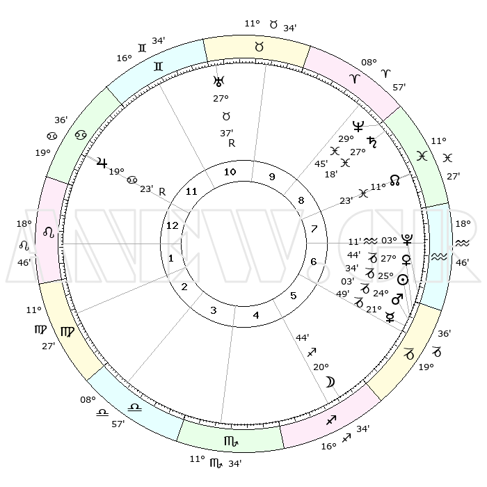 | | ΘΕΣΕΙΣ ΠΛΑΝΗΤΩΝ ΑΣΤΡΟΛΟΓΙΚΟΥ ΧΑΡΤΗ ΤΗΣ ΣΤΙΓΜΗΣ ΑΥΤΗΣ | | | | Πλανήτης | Ζώδιο | Μοίρες | Δεκαήμ. | Σε οίκο | Απόκλιση | | Ακμές των οίκων | | Ηλιος | Αιγόκερως | 25°31' | Τρίτο | 6 | 21 S 02 | | 1ος | 02°04' | Λέων | | Σελήνη | Τοξότης | 20°03' | Τρίτο | 5 | 28 S 06 | | 2ος | 23°14' | Λέων | | Ερμής | Αιγόκερως | 21°43' | Τρίτο | 6 | 23 S 29 | | 3ος | 18°34' | Παρθένος | | Αφροδίτη | Αιγόκερως | 27°40' | Τρίτο | 6 | 21 S 36 | | 4ος | 19°51' | Ζυγός | | Αρης | Αιγόκερως | 24°00' | Τρίτο | 6 | 22 S 16 | | 5ος | 25°50' | Σκορπιός | | Δίας | Καρκίνος | 19°23'R | Δεύτερο | 12 | 22 N 18 | | 6ος | 01°12' | Αιγόκερως | | Κρόνος | Ιχθείς | 27°18' | Τρίτο | 9 | 03 S 06 | | 7ος | 02°04' | Υδροχόος | | Ουρανός | Ταύρος | 27°37'R | Τρίτο | 11 | 19 N 26 | | 8ος | 23°14' | Υδροχόος | | Ποσειδώνας | Ιχθείς | 29°45' | Τρίτο | 9 | 01 S 19 | | 9ος | 18°34' | Ιχθείς | | Πλούτωνας | Υδροχόος | 03°11' | Πρώτο | 7 | 23 S 07 | | 10ος | 19°51' | Κριός | | Β. Δεσμός | Ιχθείς | 11°24' | Δεύτερο | 8 | 07 S 17 | | 11ος | 25°50' | Ταύρος | | Ωροσκόπος | Λέων | 02°04' | Πρώτο | | | 12ος | 01°12' | Καρκίνος | | Μεσουράνημα | Κριός | 19°51' | Δεύτερο | | | |