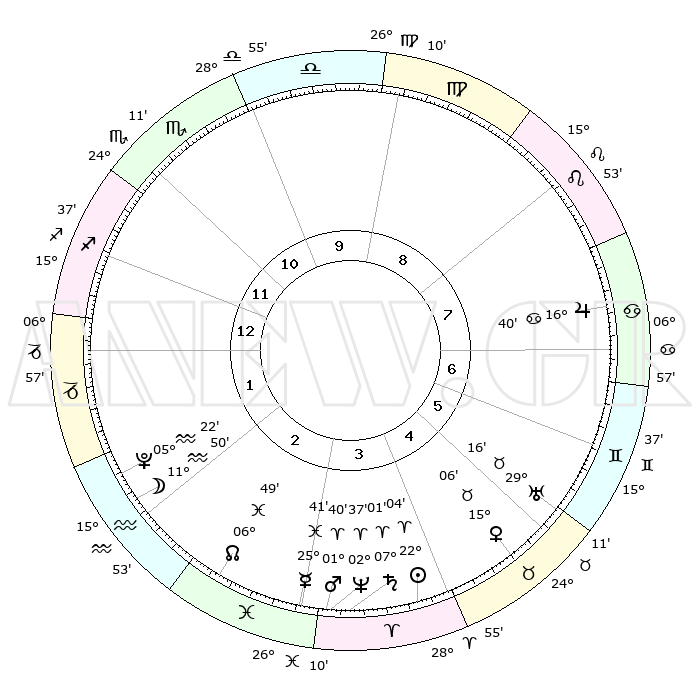 | | ΘΕΣΕΙΣ ΠΛΑΝΗΤΩΝ ΑΣΤΡΟΛΟΓΙΚΟΥ ΧΑΡΤΗ ΤΗΣ ΣΤΙΓΜΗΣ ΑΥΤΗΣ | | | | Πλανήτης | Ζώδιο | Μοίρες | Δεκαήμ. | Σε οίκο | Απόκλιση | | Ακμές των οίκων | | Ηλιος | Κριός | 22°00' | Τρίτο | 4 | 08 N 34 | | 1ος | 16°12' | Τοξότης | | Σελήνη | Υδροχόος | 11°02' | Δεύτερο | 2 | 19 S 43 | | 2ος | 20°08' | Αιγόκερως | | Ερμής | Ιχθείς | 25°36' | Τρίτο | 3 | 04 S 00 | | 3ος | 28°32' | Υδροχόος | | Αφροδίτη | Ταύρος | 15°01' | Δεύτερο | 5 | 16 N 22 | | 4ος | 04°09' | Κριός | | Αρης | Κριός | 01°37' | Πρώτο | 3 | 00 S 16 | | 5ος | 02°46' | Ταύρος | | Δίας | Καρκίνος | 16°39' | Δεύτερο | 7 | 22 N 46 | | 6ος | 25°47' | Ταύρος | | Κρόνος | Κριός | 07°00' | Πρώτο | 4 | 00 N 49 | | 7ος | 16°12' | Δίδυμοι | | Ουρανός | Ταύρος | 29°16' | Τρίτο | 6 | 19 N 49 | | 8ος | 20°08' | Καρκίνος | | Ποσειδώνας | Κριός | 02°37' | Πρώτο | 3 | 00 S 10 | | 9ος | 28°32' | Λέων | | Πλούτωνας | Υδροχόος | 05°22' | Πρώτο | 2 | 22 S 47 | | 10ος | 04°09' | Ζυγός | | Β. Δεσμός | Ιχθείς | 06°50' | Πρώτο | 3 | 09 S 00 | | 11ος | 02°46' | Σκορπιός | | Ωροσκόπος | Τοξότης | 16°12' | Δεύτερο | | | 12ος | 25°47' | Σκορπιός | | Μεσουράνημα | Ζυγός | 04°09' | Πρώτο | | | |