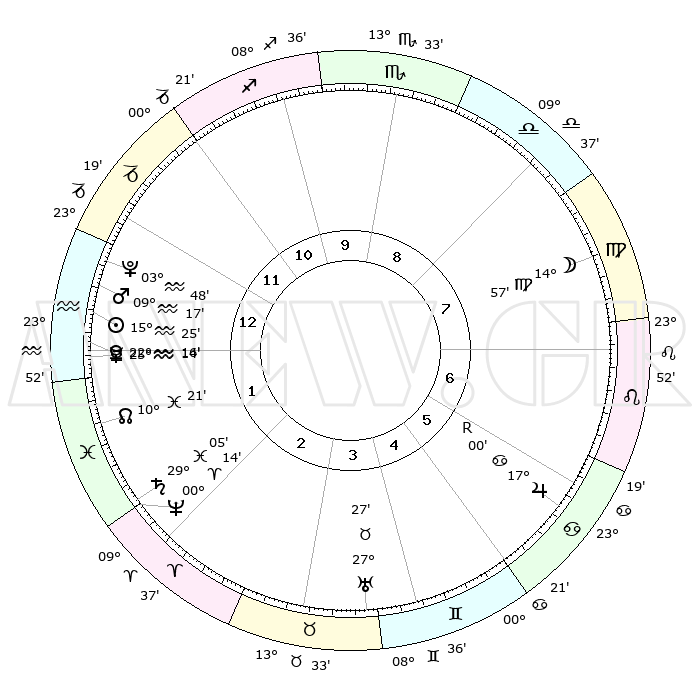 | | ΘΕΣΕΙΣ ΠΛΑΝΗΤΩΝ ΑΣΤΡΟΛΟΓΙΚΟΥ ΧΑΡΤΗ ΤΗΣ ΣΤΙΓΜΗΣ ΑΥΤΗΣ | | | | Πλανήτης | Ζώδιο | Μοίρες | Δεκαήμ. | Σε οίκο | Απόκλιση | | Ακμές των οίκων | | Ηλιος | Υδροχόος | 15°22' | Δεύτερο | 1 | 16 S 13 | | 1ος | 00°18' | Υδροχόος | | Σελήνη | Παρθένος | 14°17' | Δεύτερο | 7 | 05 N 44 | | 2ος | 14°27' | Ιχθείς | | Ερμής | Υδροχόος | 25°09' | Τρίτο | 1 | 14 S 41 | | 3ος | 22°50' | Κριός | | Αφροδίτη | Υδροχόος | 22°12' | Τρίτο | 1 | 15 S 26 | | 4ος | 21°15' | Ταύρος | | Αρης | Υδροχόος | 09°14' | Πρώτο | 1 | 18 S 57 | | 5ος | 13°60' | Δίδυμοι | | Δίας | Καρκίνος | 17°01'R | Δεύτερο | 6 | 22 N 40 | | 6ος | 05°25' | Καρκίνος | | Κρόνος | Ιχθείς | 29°05' | Τρίτο | 2 | 02 S 21 | | 7ος | 00°18' | Λέων | | Ουρανός | Ταύρος | 27°27' | Τρίτο | 4 | 19 N 24 | | 8ος | 14°27' | Παρθένος | | Ποσειδώνας | Κριός | 00°14' | Πρώτο | 2 | 01 S 07 | | 9ος | 22°50' | Ζυγός | | Πλούτωνας | Υδροχόος | 03°48' | Πρώτο | 1 | 23 S 00 | | 10ος | 21°15' | Σκορπιός | | Β. Δεσμός | Ιχθείς | 10°21' | Δεύτερο | 1 | 07 S 41 | | 11ος | 13°60' | Τοξότης | | Ωροσκόπος | Υδροχόος | 00°18' | Πρώτο | | | 12ος | 05°25' | Αιγόκερως | | Μεσουράνημα | Σκορπιός | 21°15' | Τρίτο | | | |