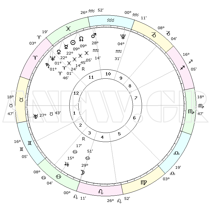 | | ΘΕΣΕΙΣ ΠΛΑΝΗΤΩΝ ΑΣΤΡΟΛΟΓΙΚΟΥ ΧΑΡΤΗ ΤΗΣ ΣΤΙΓΜΗΣ ΑΥΤΗΣ | | | | Πλανήτης | Ζώδιο | Μοίρες | Δεκαήμ. | Σε οίκο | Απόκλιση | | Ακμές των οίκων | | Ηλιος | Ιχθείς | 09°41' | Πρώτο | 12 | 07 S 56 | | 1ος | 15°30' | Κριός | | Σελήνη | Καρκίνος | 28°58' | Τρίτο | 4 | 23 N 41 | | 2ος | 21°45' | Ταύρος | | Ερμής | Ιχθείς | 22°15'R | Τρίτο | 12 | 00 S 09 | | 3ος | 16°58' | Δίδυμοι | | Αφροδίτη | Ιχθείς | 22°19' | Τρίτο | 12 | 04 S 18 | | 4ος | 08°47' | Καρκίνος | | Αρης | Υδροχόος | 28°11' | Τρίτο | 11 | 13 S 08 | | 5ος | 01°58' | Λέων | | Δίας | Καρκίνος | 15°17'R | Δεύτερο | 4 | 22 N 54 | | 6ος | 01°56' | Παρθένος | | Κρόνος | Κριός | 01°45' | Πρώτο | 12 | 01 S 16 | | 7ος | 15°30' | Ζυγός | | Ουρανός | Ταύρος | 27°43' | Τρίτο | 2 | 19 N 28 | | 8ος | 21°45' | Σκορπιός | | Ποσειδώνας | Κριός | 01°01' | Πρώτο | 12 | 00 S 48 | | 9ος | 16°58' | Τοξότης | | Πλούτωνας | Υδροχόος | 04°31' | Πρώτο | 11 | 22 S 53 | | 10ος | 08°47' | Αιγόκερως | | Β. Δεσμός | Ιχθείς | 09°05' | Πρώτο | 12 | 08 S 10 | | 11ος | 01°58' | Υδροχόος | | Ωροσκόπος | Κριός | 15°30' | Δεύτερο | | | 12ος | 01°56' | Ιχθείς | | Μεσουράνημα | Αιγόκερως | 08°47' | Πρώτο | | | |