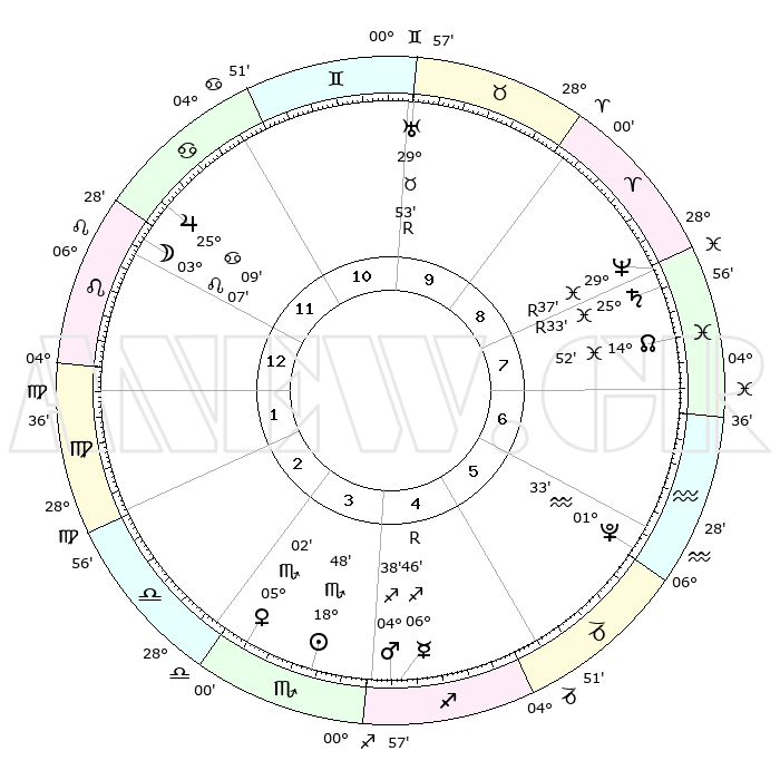 | | ΘΕΣΕΙΣ ΠΛΑΝΗΤΩΝ ΑΣΤΡΟΛΟΓΙΚΟΥ ΧΑΡΤΗ ΤΗΣ ΣΤΙΓΜΗΣ ΑΥΤΗΣ | | | | Πλανήτης | Ζώδιο | Μοίρες | Δεκαήμ. | Σε οίκο | Απόκλιση | | Ακμές των οίκων | | Ηλιος | Σκορπιός | 18°44' | Δεύτερο | 4 | 17 S 23 | | 1ος | 11°50' | Λέων | | Σελήνη | Λέων | 02°03' | Πρώτο | 12 | 23 N 09 | | 2ος | 03°50' | Παρθένος | | Ερμής | Τοξότης | 06°47'R | Πρώτο | 4 | 23 S 35 | | 3ος | 00°28' | Ζυγός | | Αφροδίτη | Σκορπιός | 04°57' | Πρώτο | 4 | 11 S 56 | | 4ος | 02°41' | Σκορπιός | | Αρης | Τοξότης | 04°34' | Πρώτο | 4 | 21 S 31 | | 5ος | 08°10' | Τοξότης | | Δίας | Καρκίνος | 25°09' | Τρίτο | 12 | 21 N 12 | | 6ος | 12°04' | Αιγόκερως | | Κρόνος | Ιχθείς | 25°33'R | Τρίτο | 8 | 04 S 00 | | 7ος | 11°50' | Υδροχόος | | Ουρανός | Ταύρος | 29°53'R | Τρίτο | 10 | 19 N 55 | | 8ος | 03°50' | Ιχθείς | | Ποσειδώνας | Ιχθείς | 29°37'R | Τρίτο | 8 | 01 S 24 | | 9ος | 00°29' | Κριός | | Πλούτωνας | Υδροχόος | 01°33' | Πρώτο | 6 | 23 S 29 | | 10ος | 02°41' | Ταύρος | | Β. Δεσμός | Ιχθείς | 14°53' | Δεύτερο | 8 | 05 S 57 | | 11ος | 08°10' | Δίδυμοι | | Ωροσκόπος | Λέων | 11°50' | Δεύτερο | | | 12ος | 12°04' | Καρκίνος | | Μεσουράνημα | Ταύρος | 02°41' | Πρώτο | | | |