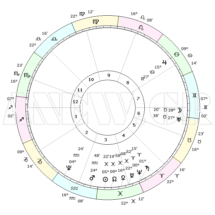 | | ΘΕΣΕΙΣ ΠΛΑΝΗΤΩΝ ΑΣΤΡΟΛΟΓΙΚΟΥ ΧΑΡΤΗ ΤΗΣ ΣΤΙΓΜΗΣ ΑΥΤΗΣ | | | | Πλανήτης | Ζώδιο | Μοίρες | Δεκαήμ. | Σε οίκο | Απόκλιση | | Ακμές των οίκων | | Ηλιος | Ιχθείς | 05°19' | Πρώτο | 4 | 09 S 34 | | 1ος | 19°59' | Σκορπιός | | Σελήνη | Ταύρος | 27°31' | Τρίτο | 7 | 24 N 38 | | 2ος | 19°55' | Τοξότης | | Ερμής | Ιχθείς | 22°07' | Τρίτο | 4 | 01 S 04 | | 3ος | 24°04' | Αιγόκερως | | Αφροδίτη | Ιχθείς | 16°54' | Δεύτερο | 4 | 06 S 29 | | 4ος | 29°40' | Υδροχόος | | Αρης | Υδροχόος | 24°45' | Τρίτο | 3 | 14 S 18 | | 5ος | 01°45' | Κριός | | Δίας | Καρκίνος | 15°28'R | Δεύτερο | 8 | 22 N 52 | | 6ος | 28°09' | Κριός | | Κρόνος | Κριός | 01°14' | Πρώτο | 4 | 01 S 28 | | 7ος | 19°59' | Ταύρος | | Ουρανός | Ταύρος | 27°38' | Τρίτο | 7 | 19 N 27 | | 8ος | 19°55' | Δίδυμοι | | Ποσειδώνας | Κριός | 00°52' | Πρώτο | 4 | 00 S 51 | | 9ος | 24°04' | Καρκίνος | | Πλούτωνας | Υδροχόος | 04°24' | Πρώτο | 3 | 22 S 54 | | 10ος | 29°40' | Λέων | | Β. Δεσμός | Ιχθείς | 09°19' | Πρώτο | 4 | 08 S 05 | | 11ος | 01°45' | Ζυγός | | Ωροσκόπος | Σκορπιός | 19°59' | Δεύτερο | | | 12ος | 28°09' | Ζυγός | | Μεσουράνημα | Λέων | 29°40' | Τρίτο | | | |
